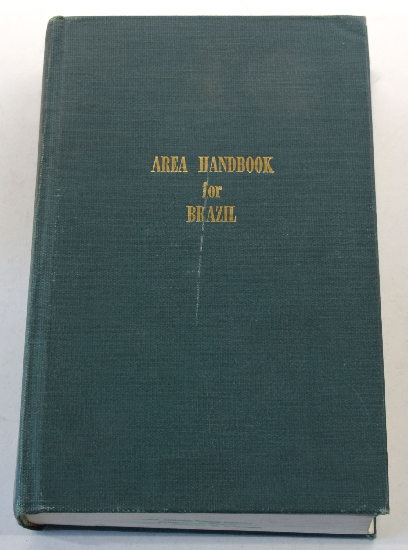 (2) Area Handbook for Brazil by Weil, Thomas E. et al.; U.S. Government Printing Office; 1971; 645p; 12mo; Hardcover; ex library; Green buckram gilt; splitting of endpapers along inside front and back cover; This book was put out by the Foreign Area Studies (FAS) of the American University as a compendium of facts about the social, economic, political, and military institutions and practices of Brazil.