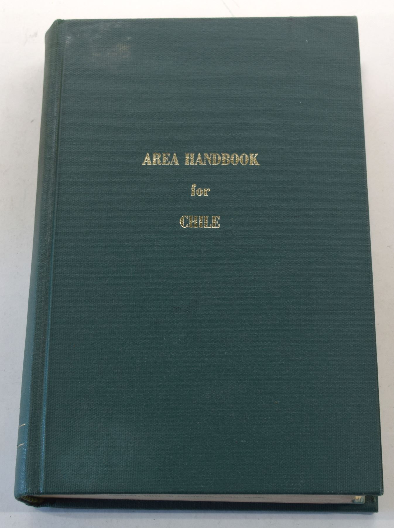 (3) Area Handbook for Chile by Weil, Thomas E. et al.; U.S. Government Printing Office; 1969; 509p; 12mo; Hardcover; ex library; Green buckram gilt; Some water staining to last several pages of index and endpapers; This book was put out by the Foreign Area Studies (FAS) of the American University as a compendium of facts about the social, economic, political, and military institutions and practices of Chile.