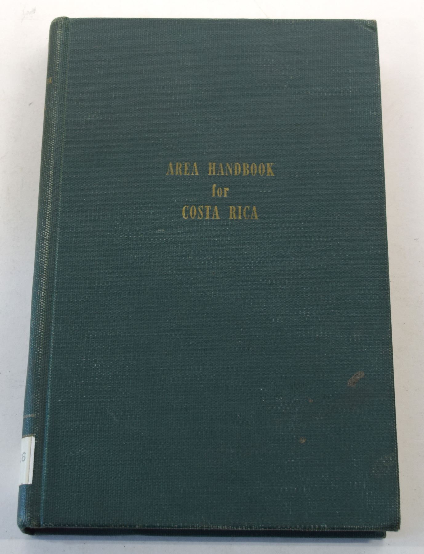 (5) Area Handbook for Costa Rica by Blutstein, Howard I. et al.; U.S. Government Printing Office; 1969; 323p; 12mo; Hardcover; ex library; Green buckram gilt; This book was put out by the Foreign Area Studies (FAS) of the American University as a compendium of facts about the social, economic, political, and military institutions and practices of Costa Rica.