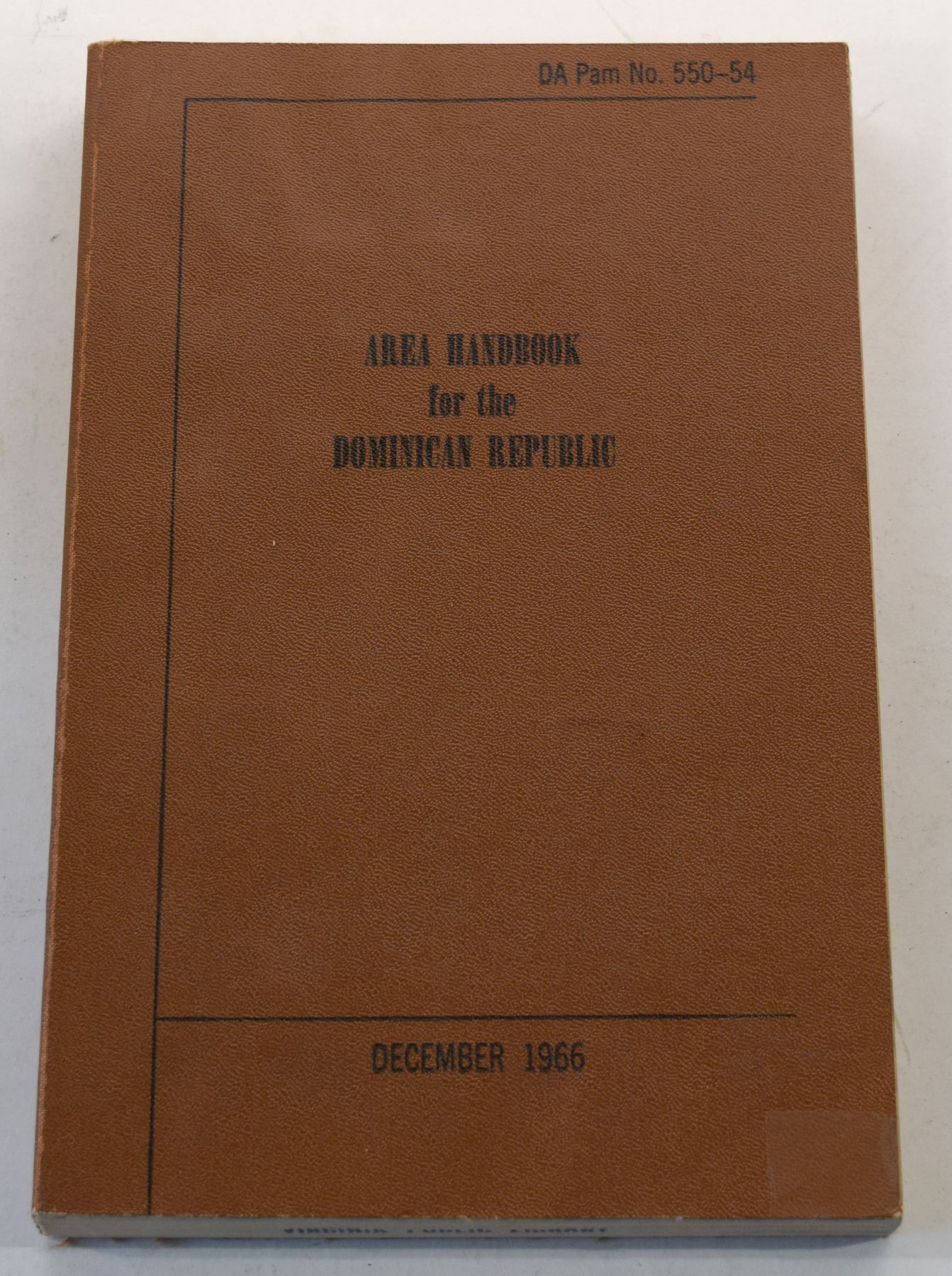 (6) Area Handbook for the Dominican Republic by Roberts, T.D. et al.; U.S. Government Printing Office; 1966; 446p; 12mo; Softcover; ex library; Brown buckram; This book was put out by the Foreign Area Studies (FAS) of the American University as a compendium of facts about the social, economic, political, and military institutions and practices of the Dominican Republic.