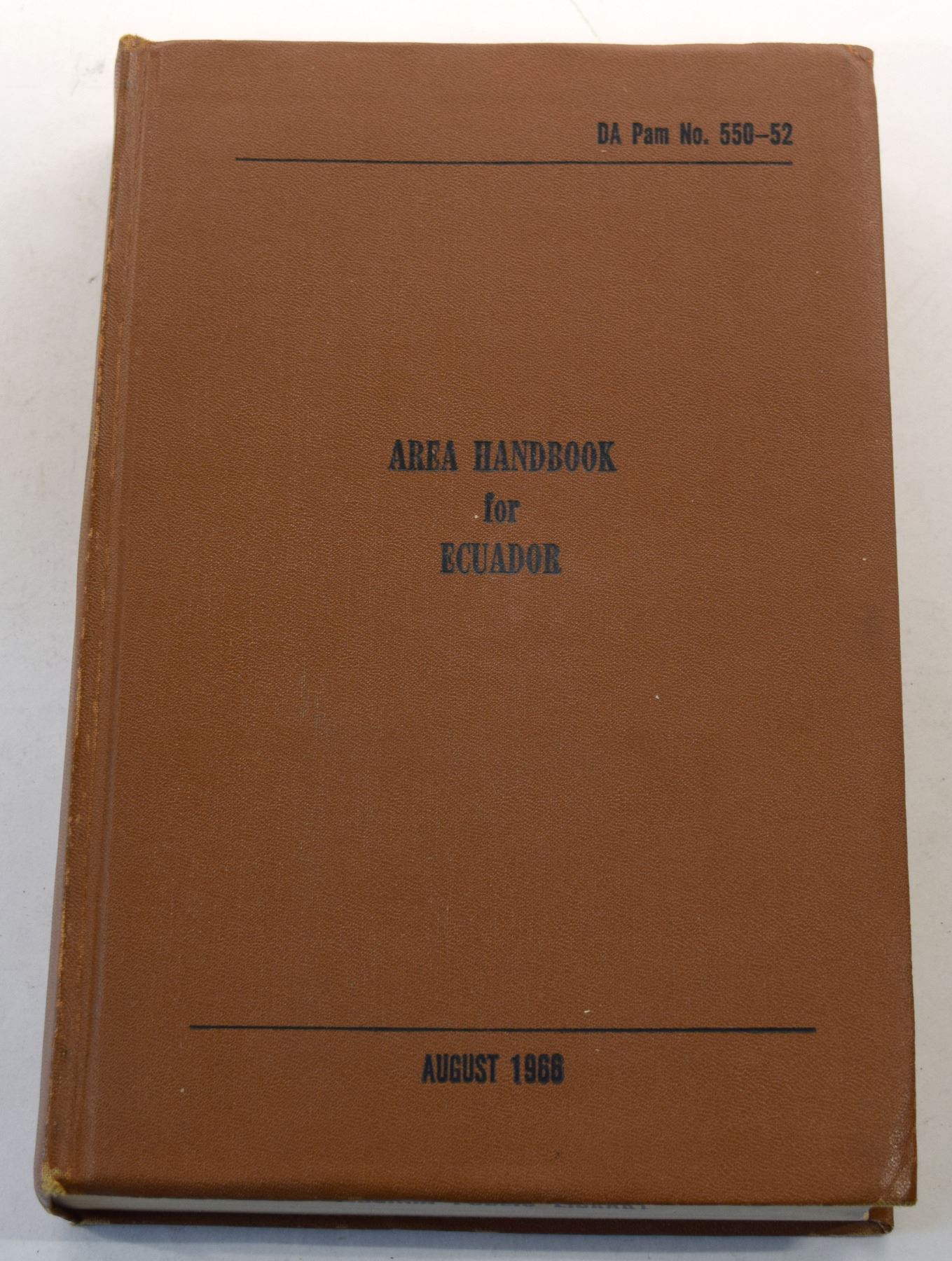 (7) Area Handbook for Ecuador by Erickson, Edwin E. et al.; U.S. Government Printing Office; 1966; 561p; 12mo; Hardcover; ex library; Brown buckram; This book was put out by the Foreign Area Studies (FAS) of the American University as a compendium of facts about the social, economic, political, and military institutions and practices of Ecuador.