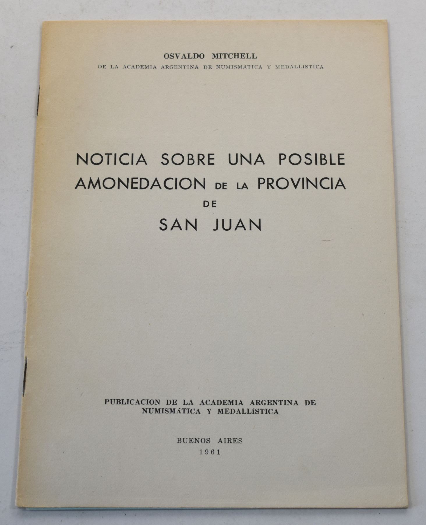 (5) Notica Sobre una Posible Amonedacion de la Provincia de San Juan by Mitchell, Osvaldo; La Academia Argentina de Numismatica y Medallista; 1961; 3p; 8vo; Softcover; ex libris Frank Katen; Ex Katen sale 77 lot 696.