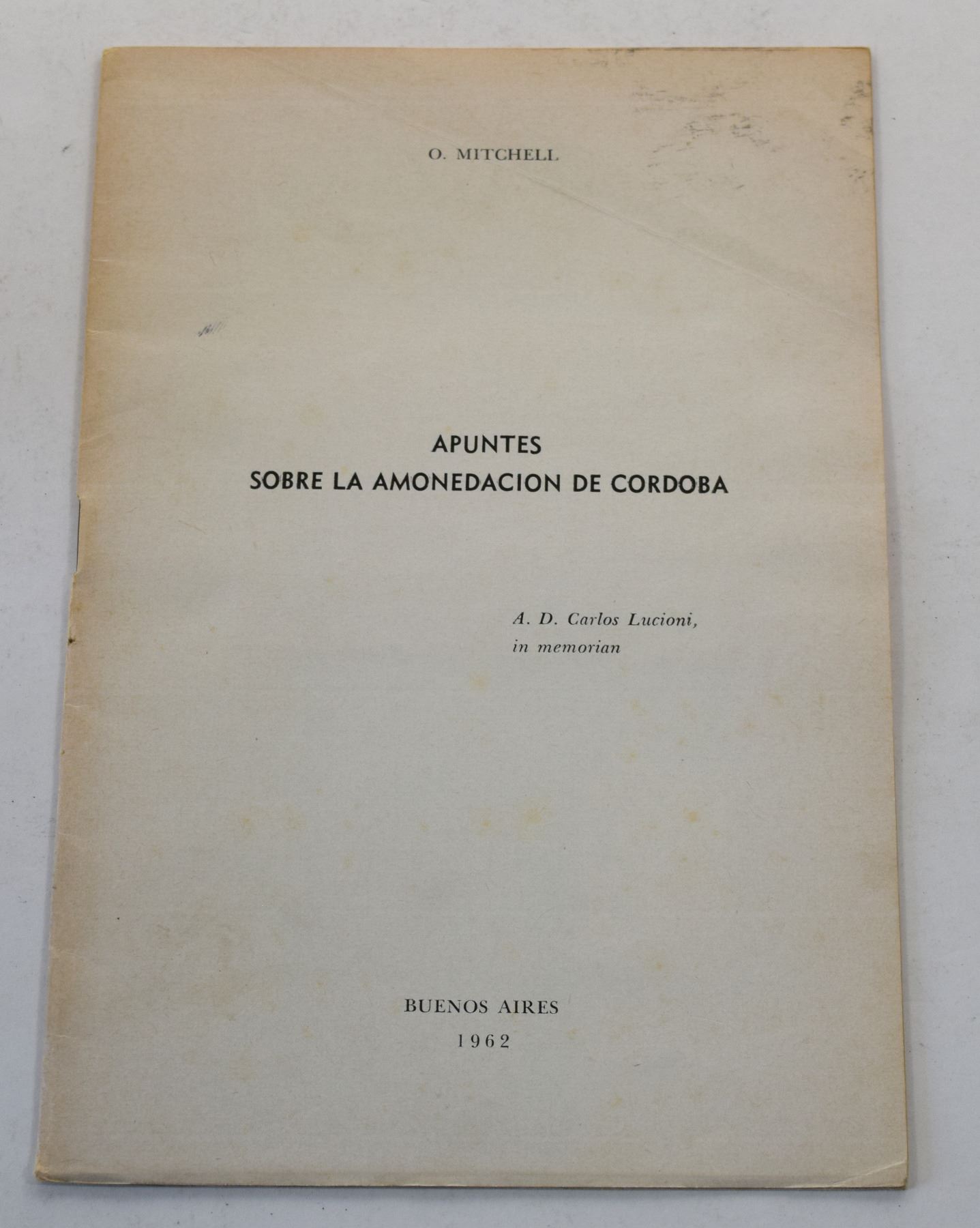 (9) Apuntes Sobre la Amonedacion de Cotdoba by Mitchell, Osvaldo; Osvaldo Mitchell; 1962; 13p; 12mo; Softcover; ex libris Frank Katen; Ex Katen sale 77 lot 697.