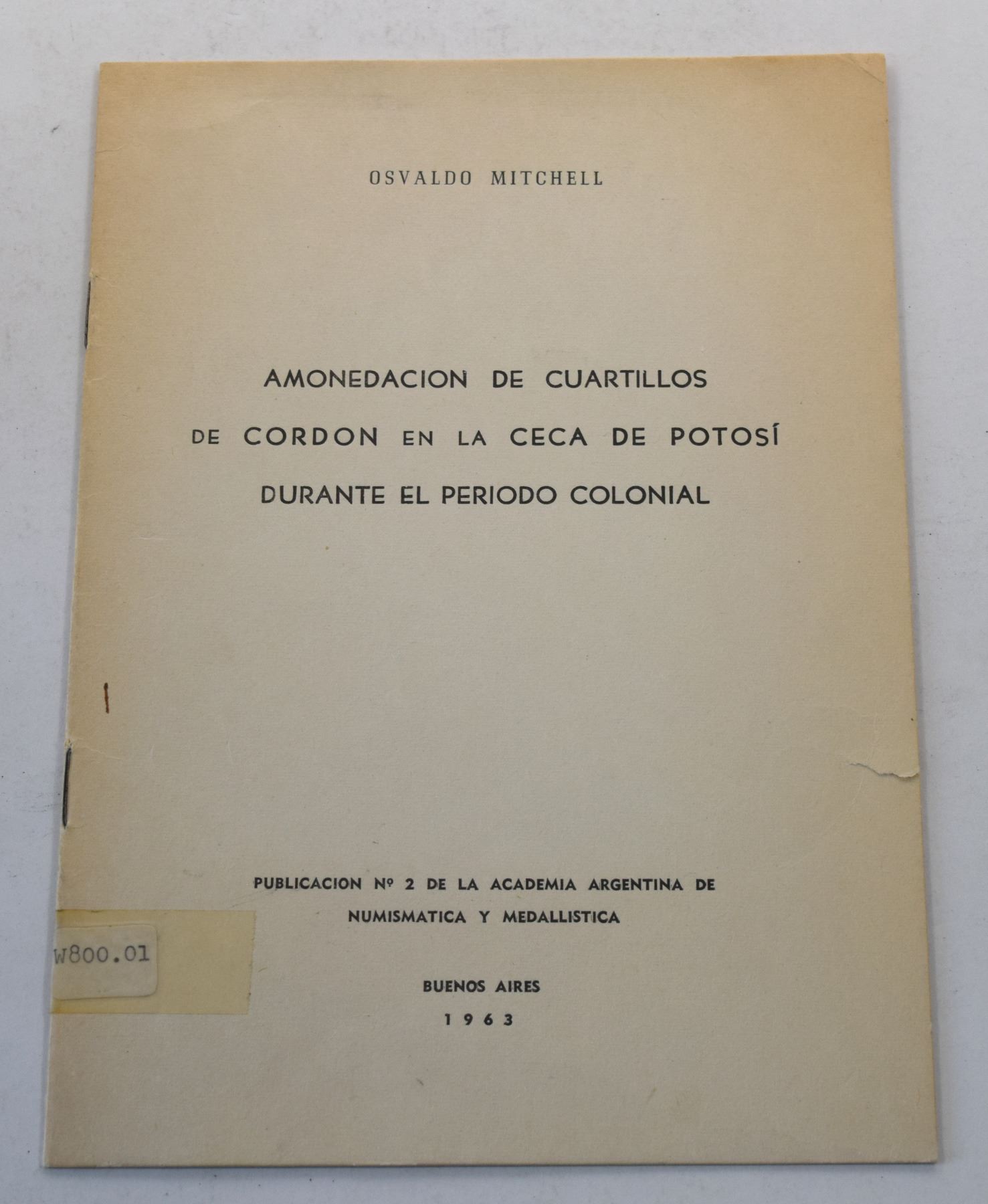 (1) Amonedacion de Cuartillos de Cordon en la Ceca de Potosi Durante el Periodo Colonial by Mitchell, Osvaldo; La Academia Argentina de Numismatica y Medallista; 1963; 7p; 8vo; Softcover; illus.; Publicacion No. 2.