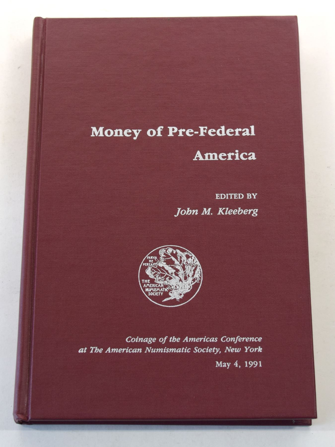 (1) Money of Pre-Federal America edited by Kleeberg, John M.; The American Numismatic Society; 1992; 253p; 12mo; Hardcover; Maroon buckram gilt; Coinage of the Americas Conference, Proceedings No. 7, May 4, 1991
