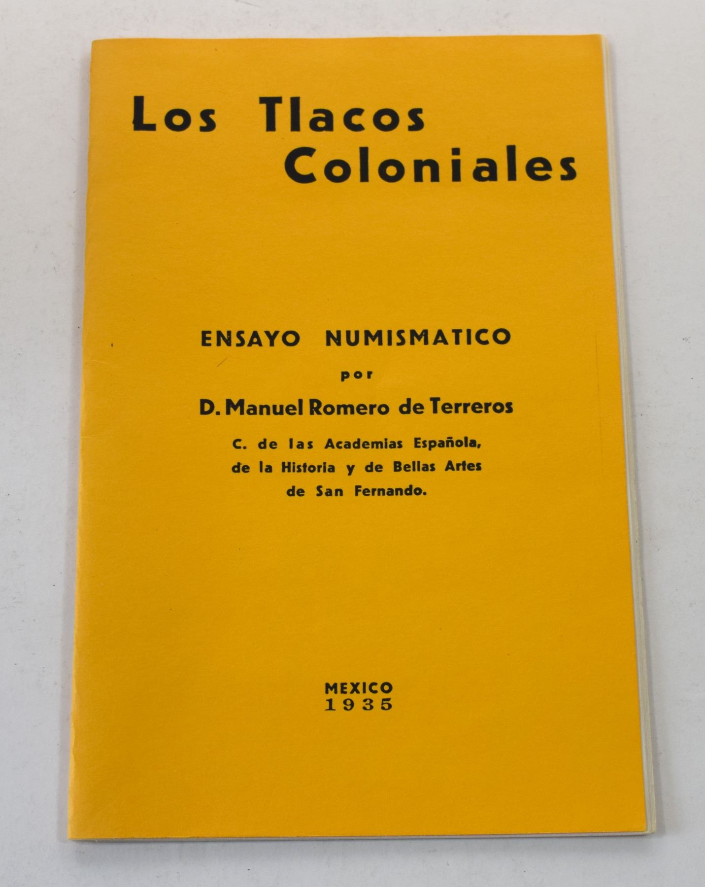 (4) Los Tlacos Coloniales by Romero de Terreros, D. Manuel; Jerry F. Schimmel; 32p; 12mo; Softcover; illus.; light pencil notes in the margins; reprint of the 1935 Las Academias Española, de la Historia y de Bellas Aries de San Fernando original.