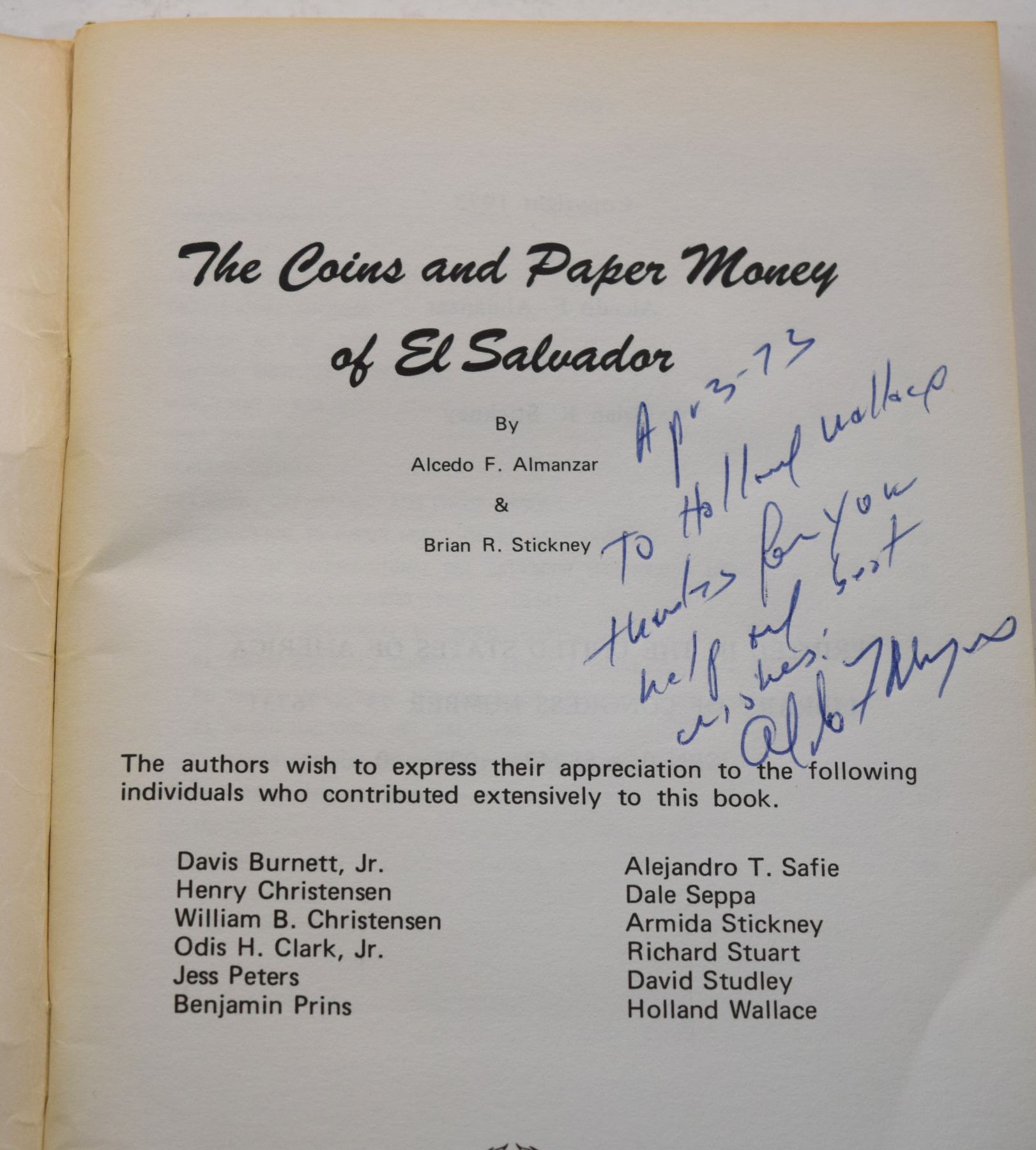 (3) The Coins and Paper Money of El Salvador by Almanzar, Alcedo F. & Brian R. Stickney; Almanzar's Coins of the World; 1973; 88p; 12mo; Softcover; Inscribed by the author.