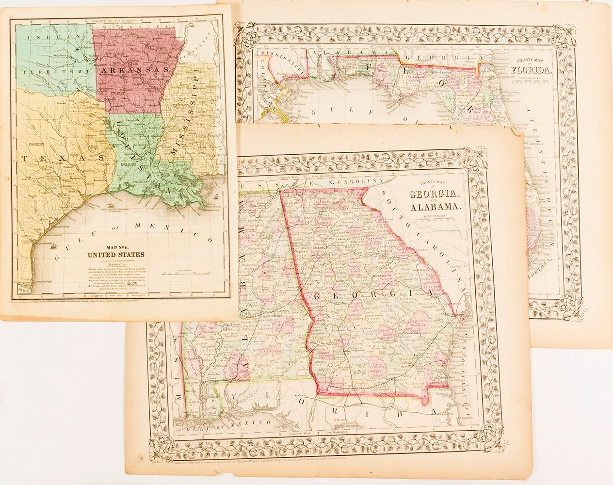 Single page multi color map of Counties of Georgia and Alabama p.3312.5" x 15.25". Single page multi color County Map of Florida 1870, p. 37, 12.25" x 15.25". Single page Map No. 6 U.S. 1847 by Caty & Burgess 11.25 x 9.25". Date: 1867 Location: Georgia HWAC # 54233
