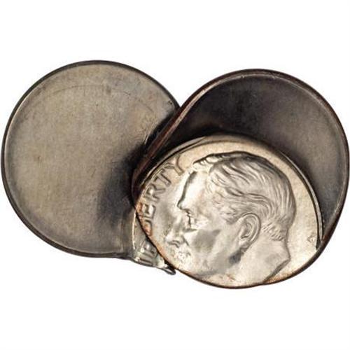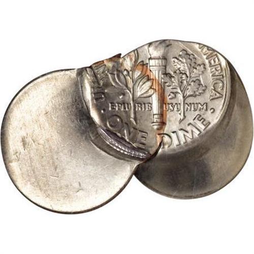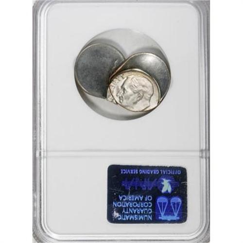 <B>Undated Clad Roosevelt Dime--Multiple Struck, Bonded Pair--MS65 NGC.</B></I> The first strike was approximately 90% off center toward 4 o'clock. The dime failed to eject, and was struck a second time, this time bonding with a newly fed planchet. This second strike was 85% off center toward 4:30 relative to the first planchet, and 35% off center toward 7 o'clock relative to the second planchet. The date and any mintmark are off the flans.<BR><BR><B>Coin Engraver:</B> John R. Sinnock<BR><BR><b>Shipping:</b> Coins & Currency (<a target="_blank" href="http://www.heritageauctions.com/common/shipping.php">view shipping information</a>)