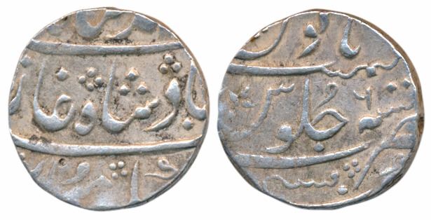 Mumbai Mint, Silver Rupee, in the name of Muhammad Shah, RY 6, complete mint name at bottom. Very Fine+.