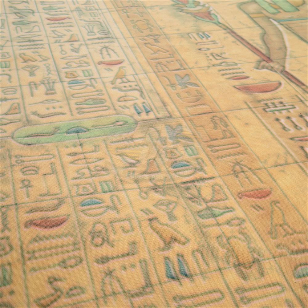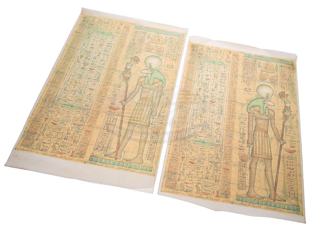 (Universal Pictures, 1999) This set of two miniature Egyptian motif wall panels were custom-made for the production of the film by Industrial Light & Magic for special miniature effects shots of Thebes, City of the Living. The wall panels are printed on canvas and feature Egyptian symbols, art and an Egyptian God. The panels each measure 21" x 29".