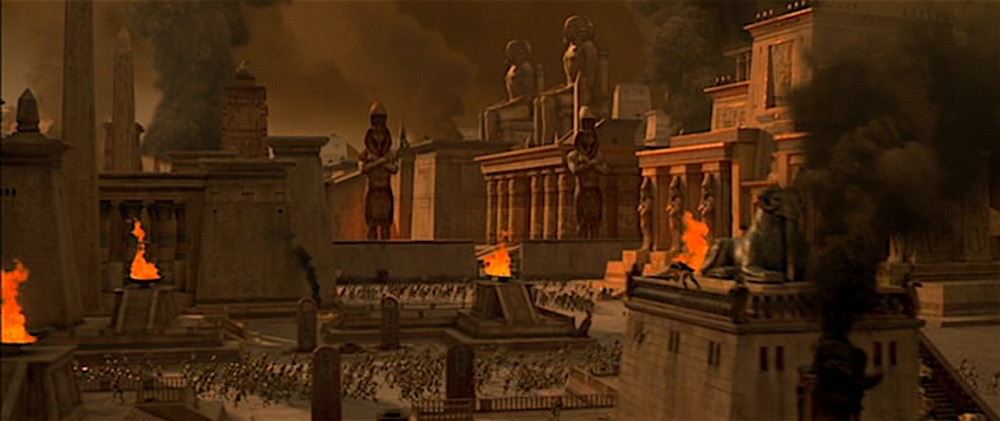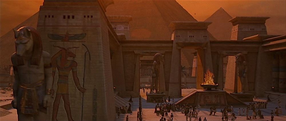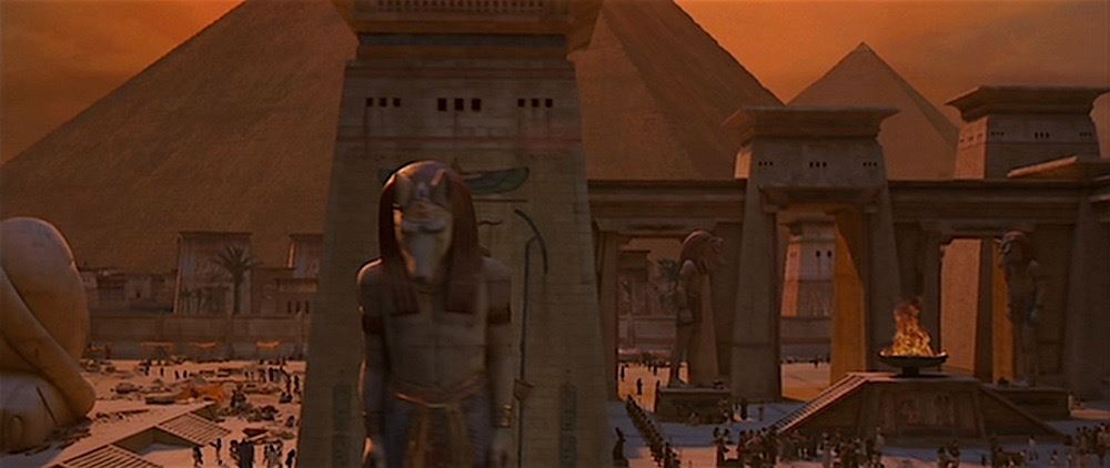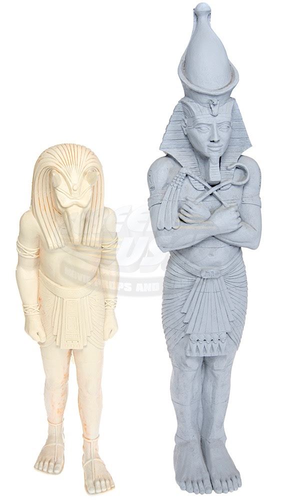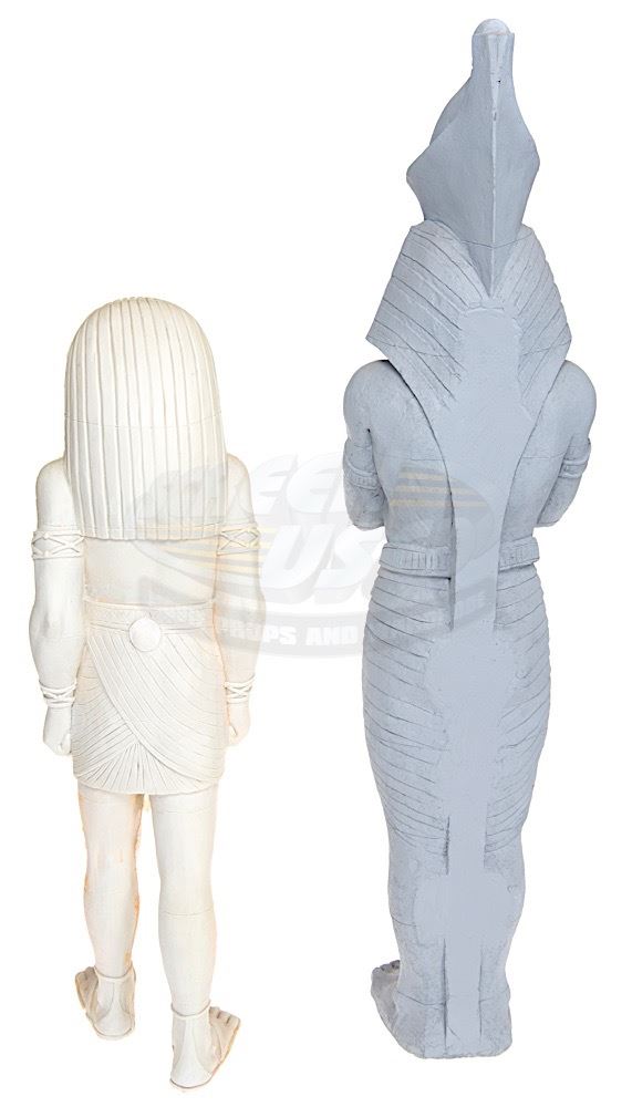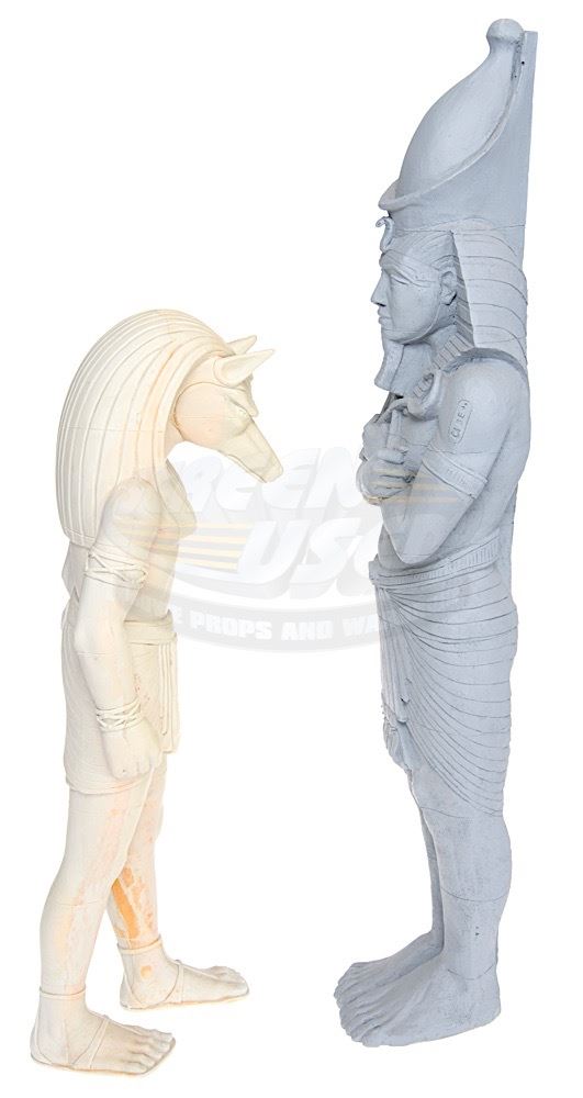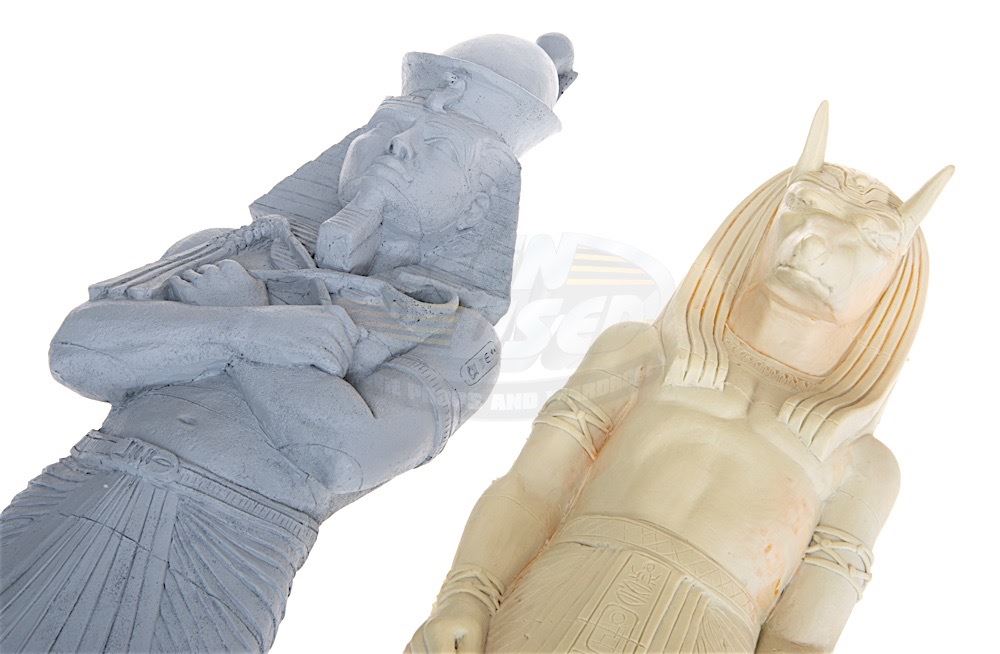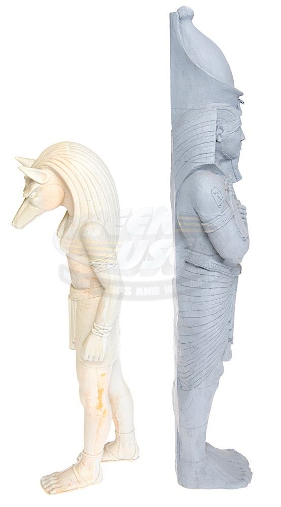 (Universal Pictures, 1999) This set of miniature statues were custom-made for the production of the film by Industrial Light & Magic for special miniature effects shots of Thebes, City of the Living. The statues consist of the Egyptian God Anubis and the Egyptian Pharaoh, Ramses the Great. Both statues are made of hard foam and remain unfinished. The Ramses statue measures 30" x 7" x 4.5" and the Anubis statue measures 23" x 6.5" x 6.5".