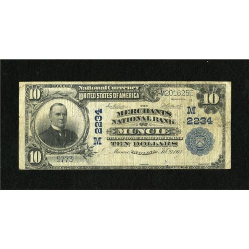 <B>Muncie, IN</B></I> - $10 1902 Plain Back Fr. 631 <B>The Merchants NB</B></I> Ch. # (M)2234<BR>Officers were B.F. Shroyer and F.B. Bernard, but their signatures have faded from this note. <B>Very Good.</B></I><BR><BR><b>Shipping:</b> Coins & Currency (<a target="_blank" href="http://www.heritageauctions.com/common/shipping.php">view shipping information</a>)