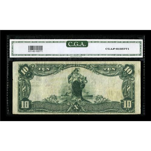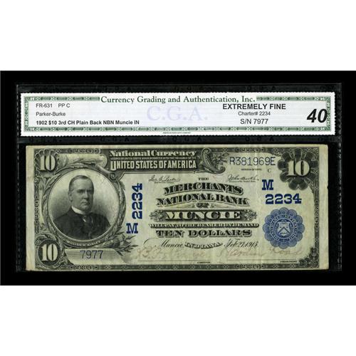 <B>Muncie, IN</B></I> - $10 1902 Plain Back Fr. 631 <B>The Merchants NB</B></I> Ch. # (M)2234<BR>Here is a pleasing note from the third title for this issuer graded <B>CGA Extremely Fine 40.</B></I><BR><BR><b>Shipping:</b> Coins & Currency (<a target="_blank" href="http://www.heritageauctions.com/common/shipping.php">view shipping information</a>)