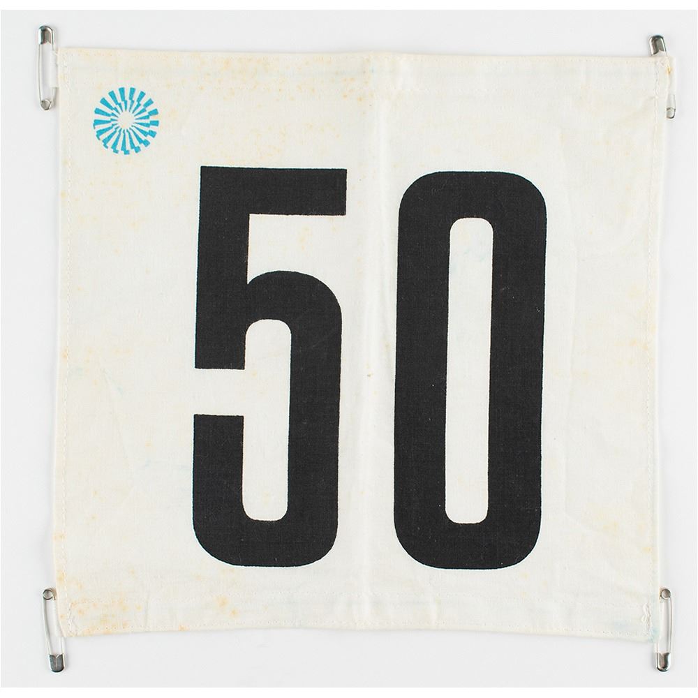 Scarce cloth competitor's number from the Munich 1972 Summer Olympics, measuring 9.5″ x 9″, with the front featuring the XX Olympiad emblem to upper left and the competitor’s number in bold digits: “50.†Each corner bears loops with safety pins. In fine condition, with a vertical fold and scattered light stains.