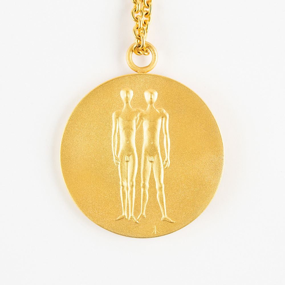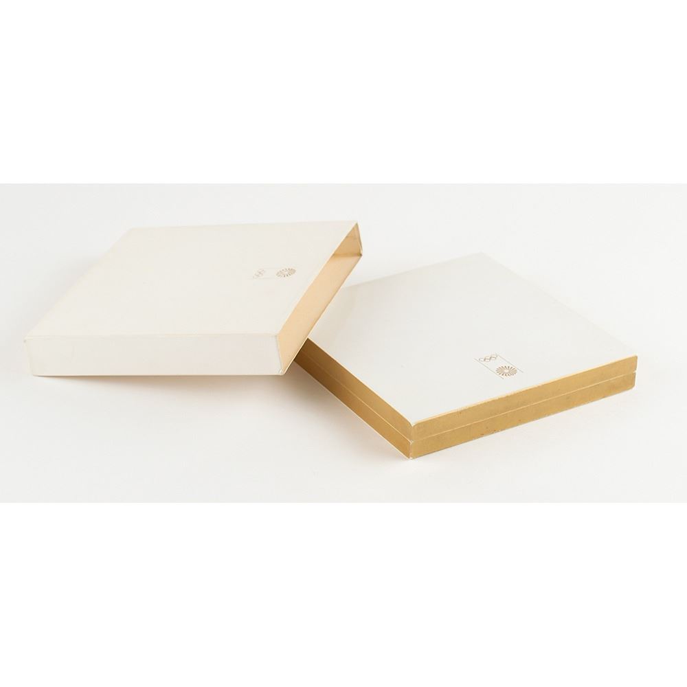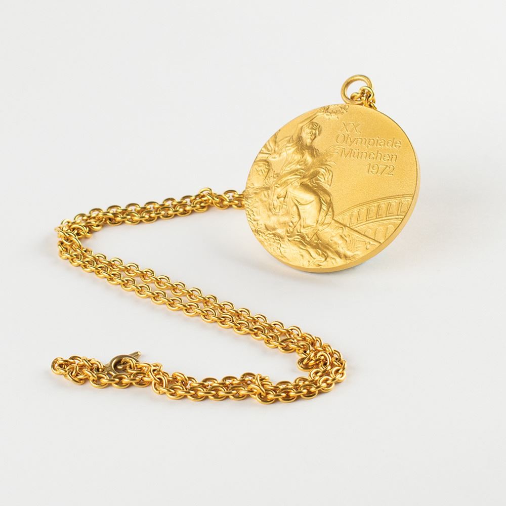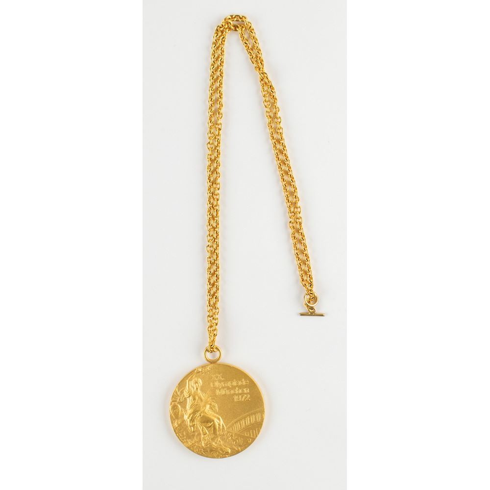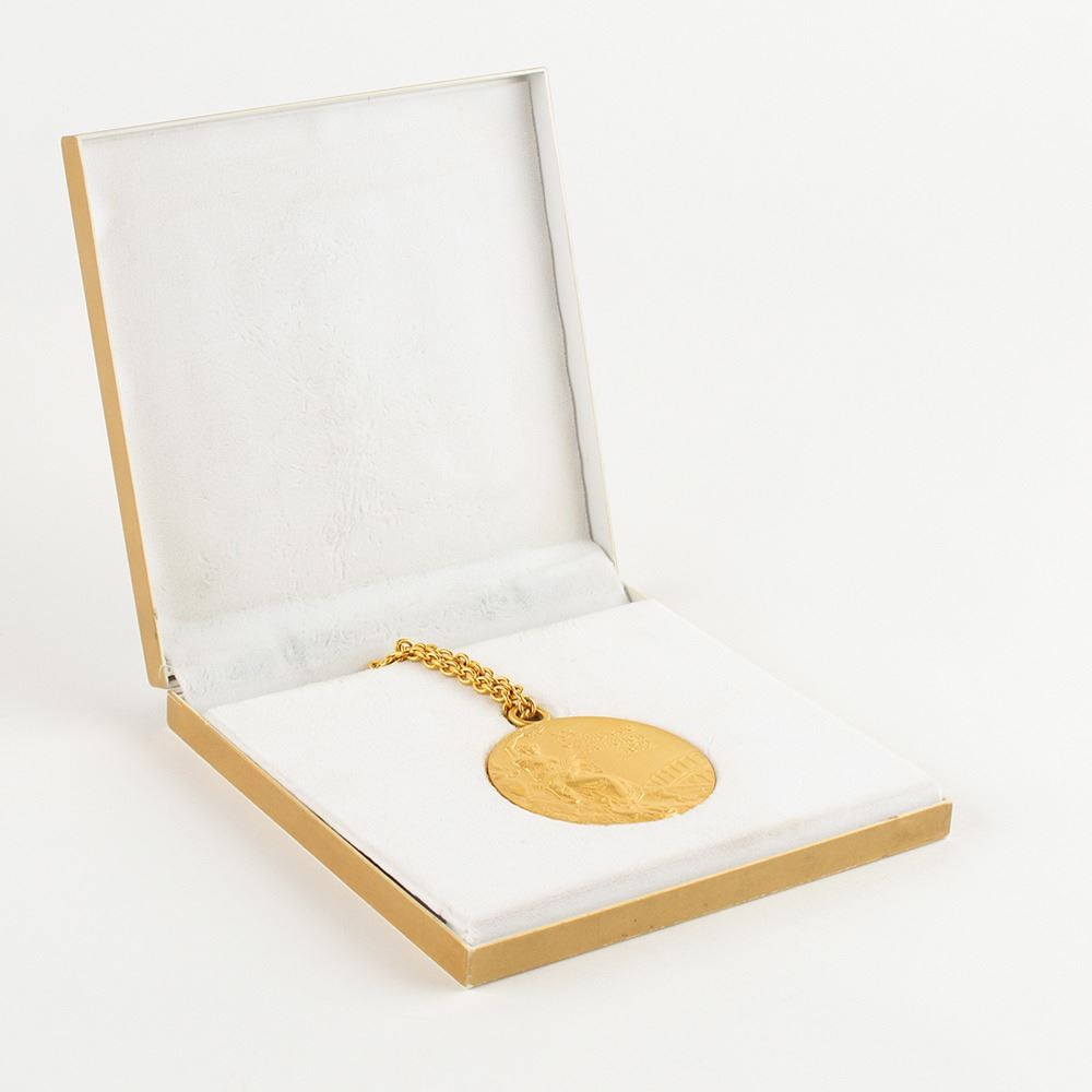 Highly sought-after unawarded winner's medal issued for the Munich 1972 Summer Olympics. Gilt silver, 66 mm, 158 gm (without chain) or 211 gm (with chain), by Gerhard Marcks; manufactured by the Bavarian Mint. The front is inscribed, “XX. Olympiade Munchen 1972,†and depicts the 'Seated Victory' with the Colosseum in the background; the reverse portrays the mythological twins Castor and Pollux, the patrons of competitive sport and friendship, with the artist's monogram below. Complete with its original golden chain, hinged plastic presentation box, and cardboard slipcover. This was the first winner's medal since 1928 to feature a new design on the reverse, replacing the traditional depiction of a victorious athlete carried by a jubilant crowd. A handsome and well-preserved example of this appealing medal.