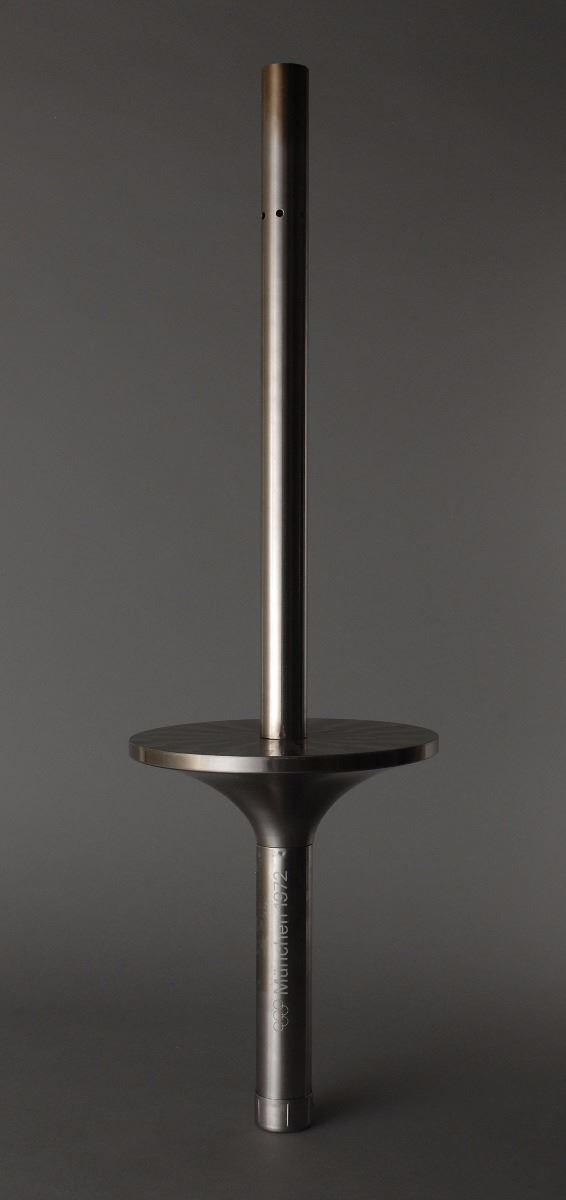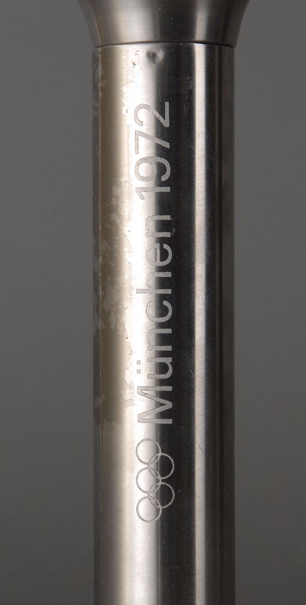 Official 1972 Munich Olympics torch, comprised of metal and steel, measuring 29? in length and 8.5? at its widest, designed by Friedrich Krupp AG. The torch bears Olympic rings and the inscription “Spiele der XX Olympiad, Munchen 1972” on its handle, with the name of the designer engraved on the bottom. The Munich Games emblem designs a platform at the base of the combustion tube. Some scuffing and soiling to handle. Traveling a shade over 5,500 km over the course of 30 days, roughly 6,000 torchbearers were used to reach and light the Olympic flame at the opening ceremony on August 26, 1972. Oversized.