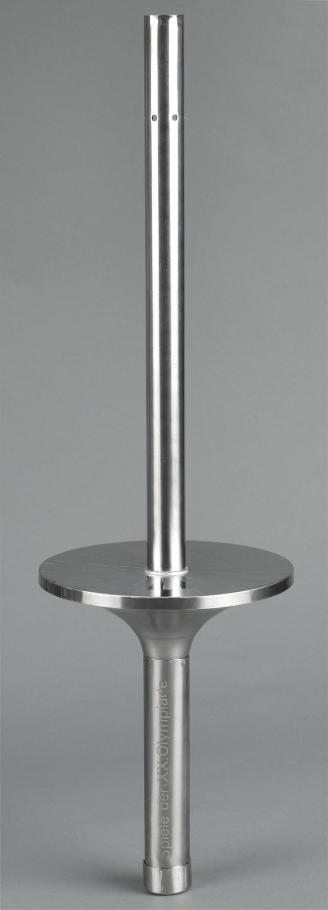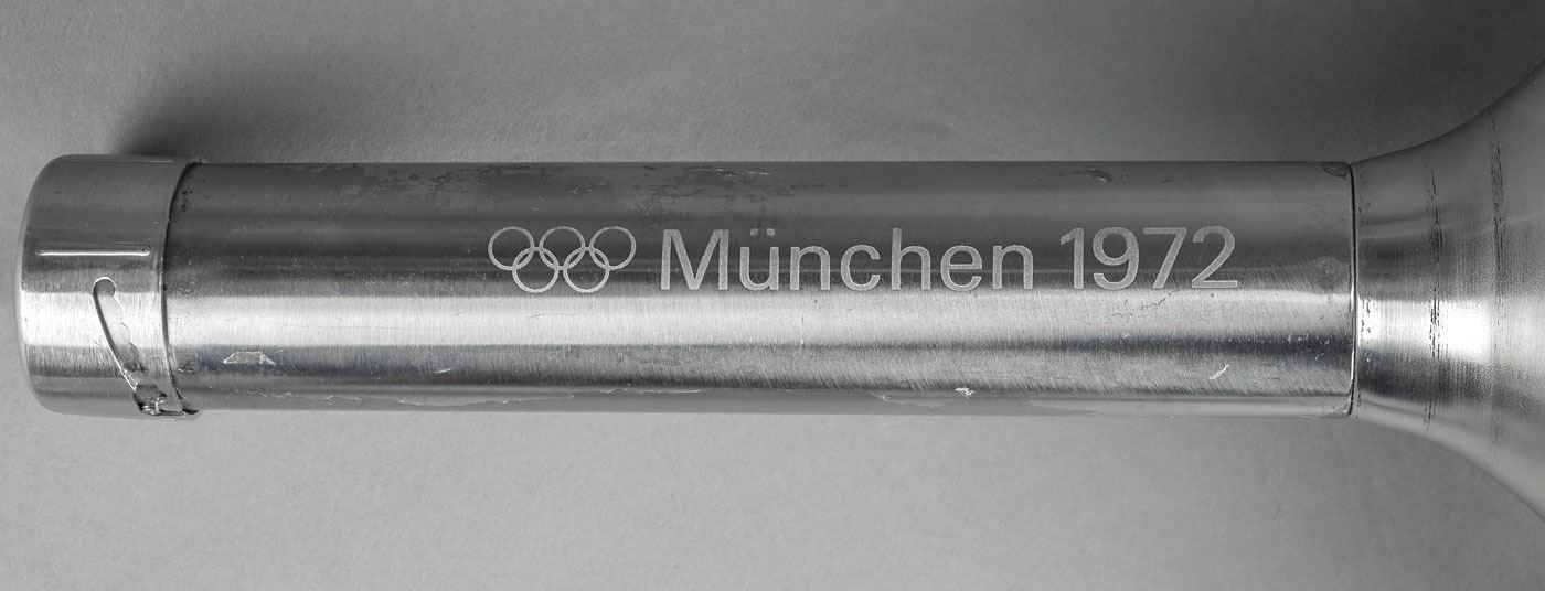 Official 1972 Munich Olympics torch, comprised of metal and steel, measuring 29? in length and 8.5? at its widest, designed by Friedrich Krupp AG. The torch bears Olympic rings and the inscription “Spiele der XX Olympiad, Munchen 1972” on its handle, with the name of the designer engraved on the bottom. The Munich Games emblem designs a platform at the base of the combustion tube. Some scuffing and marks to handle. Traveling a shade over 5,500 km over the course of 30 days, roughly 6,000 torchbearers were used to reach and light the Olympic flame at the opening ceremony on August 26, 1972. A coveted artifact commemorating Germany’s stalwart role in international sport.