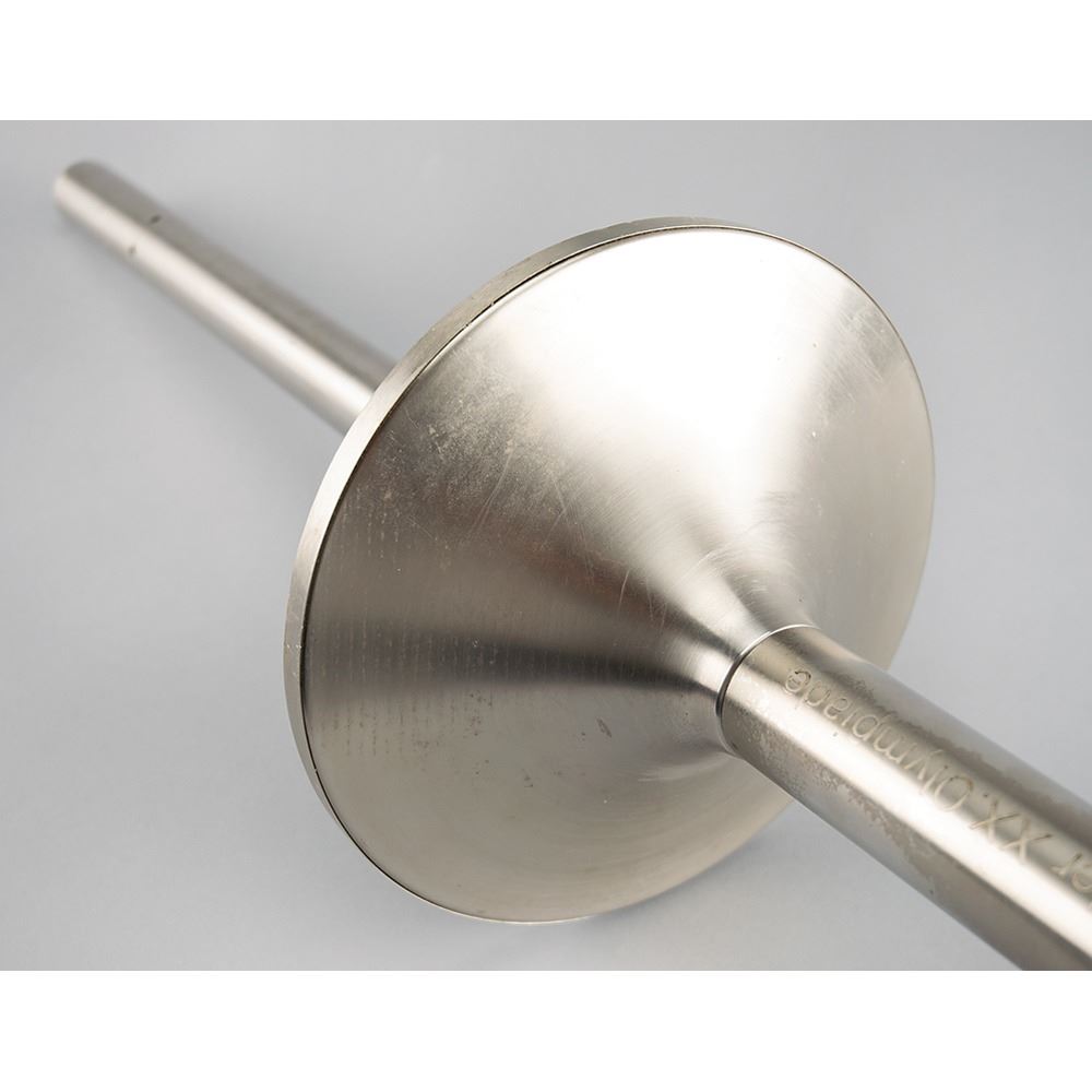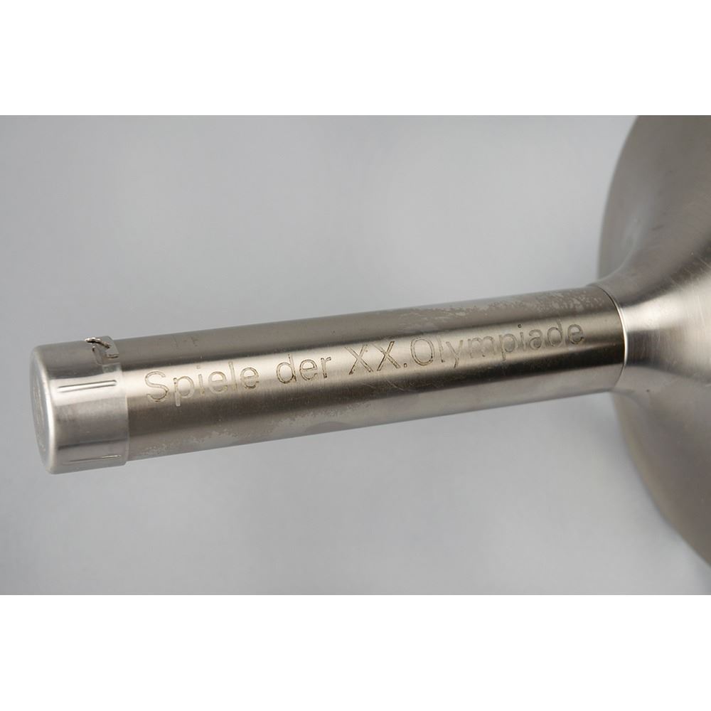 Official 1972 Munich Olympics torch, comprised of metal and steel, measuring 29″ in length and 8.5″ at its widest, designed by Friedrich Krupp AG. The torch bears Olympic rings and the inscription "Spiele der XX Olympiad, Munchen 1972" on its handle, with the name of the designer engraved on the bottom. The Munich Games emblem designs a platform at the base of the combustion tube. Platform and handle feature scattered small scuffs and marks. Traveling a shade over 5,500 km over the course of 30 days, roughly 6,000 torchbearers were used to reach and light the Olympic flame at the opening ceremony on August 26, 1972. A coveted artifact commemorating Germany's stalwart role in international sport.