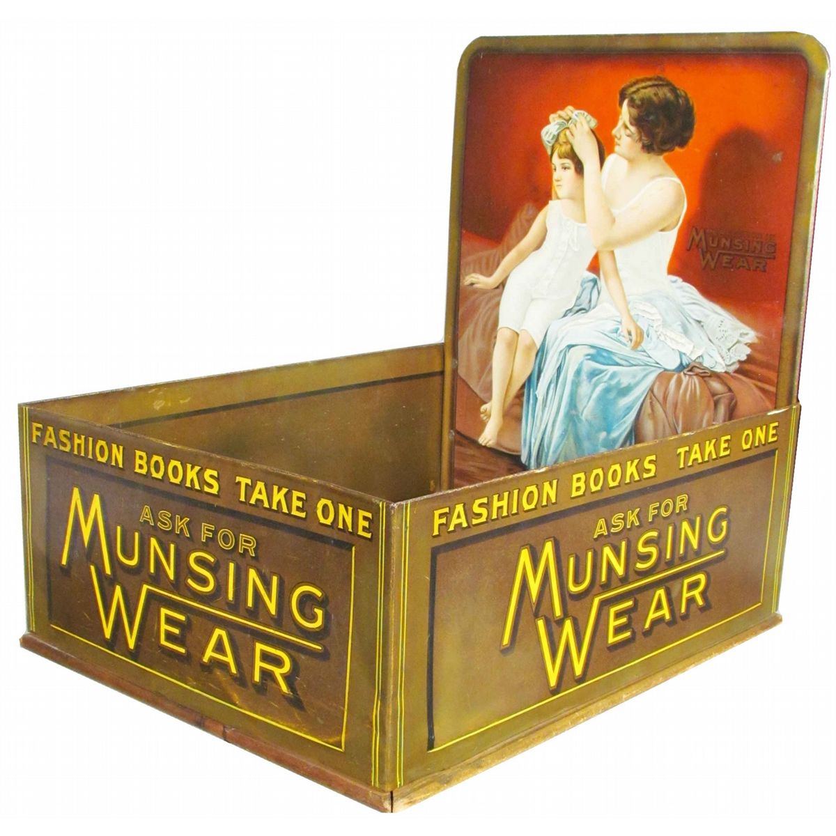 Munisingwear Tin Store Display. Used to display complimentary fashion books. Professional restoration. 11 3/4 X 14 3/4 X 15 inches.