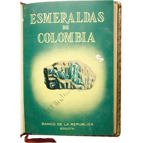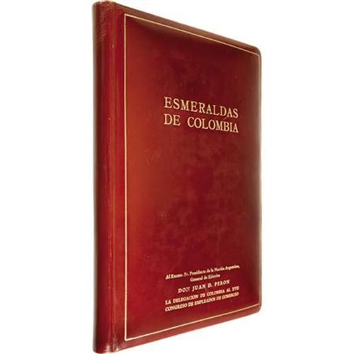 <B>G. Otero Munoz and A. M. Barriga Villalba: <I>Esmeraldas de Colombia</B></I></B></I> (Bogota: Fundacion del Banco de Republica Colombia, 1948), 25th anniversary commemorative edition, in Spanish, 137 pages, illustrations, photographs, color map, red-leather binding with gilt lettering, 4to (8” x 10.75”), gilt edges. This commemorative copy was presented to Argentine President Juan Peron by the Colombian Delegation to the 17th Congress of Commercial Employees in 1948, and signed on the interior cover “Pretelt Martinez” (Antonio Ma. Pretelt Martinez). The book is in very good condition with moderate wear to the exterior leather covers.<BR><BR><b>Shipping:</b> Books & Catalogs (<a target="_blank" href="http://www.heritageauctions.com/common/shipping.php">view shipping information</a>)