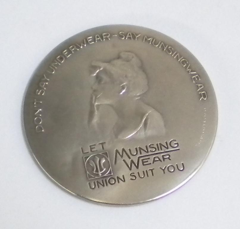 This is an extremely well made mirror. It looks to have an embossed metal cover and the mirror is beveled. Across the top it reads "DON'T SAY UNDERWEAR - SAY MUNSINGWEAR." It is 2-3/8 inches in diameter. This is an unusual mirror and would make a great addition to your collection.