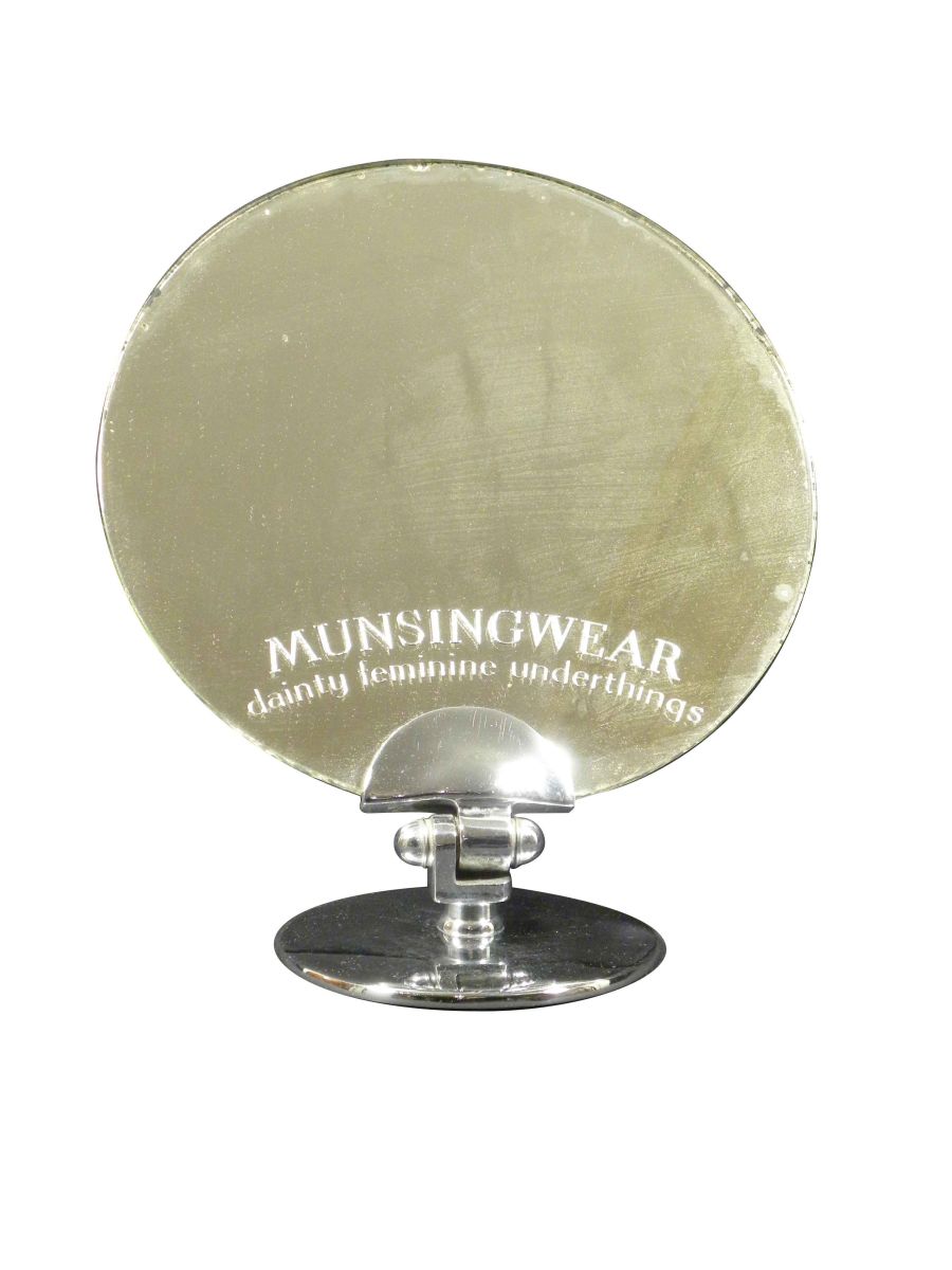 Munsingwear Store Mirror, "Dainty Feminine Underthings". Some silver loss to mirror otherwise good condition. 12 X 12 X 6 inches.