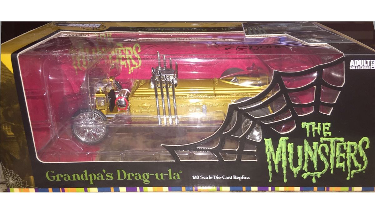 A gorgeous large 1/18 scale of the Munsters famed Dragula coffin car signed by Eddie Munster Butch Patrick and by car designer George Barris on the outside of the cars see thru lid