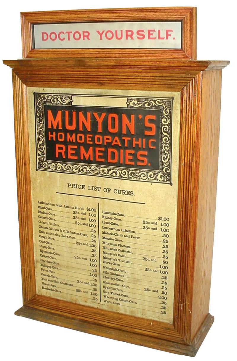 Munyon's Homoeopathic Remedies cabinet w/top sign, tin litho door panel shows prices of remedies, 41