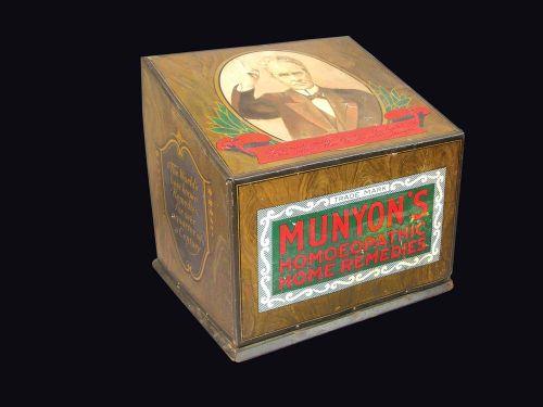 Munyons Homeopathic Home Remedies Tin Store Display with three drawers in back. Minor scratches and dents otherwise good condition. 15 X 14 X 12 inches.
