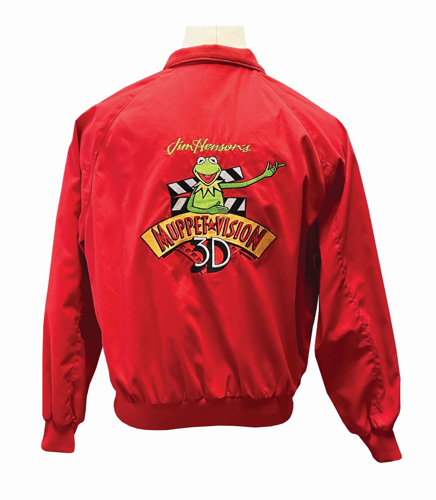 (Disney-MGM, 1991) An original cast and crew jacket for Muppet*Vision 3D. This eye-catching red jacket has an embroidered Animal on the front chewing on a "cast & crew" sign, with the attraction's logo embroidered on the back. Marked as a size XL, the jacket is in very good condition with some minor wear from use.