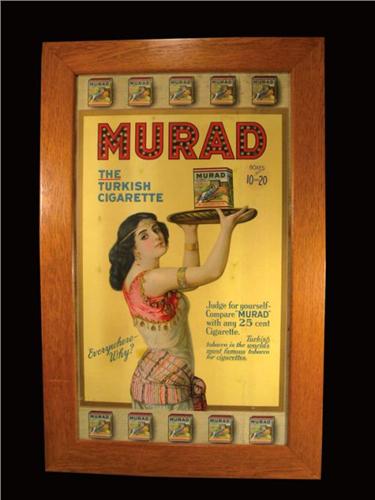 Murad Cigarette Heavy Cardboard Sign. Logo has 1/4 inch holes throughout black portion. Possibly for jewels no longer there. Some minor crease and dents otherwise excellent condition, in period frame. 23 X 40 inches image only.