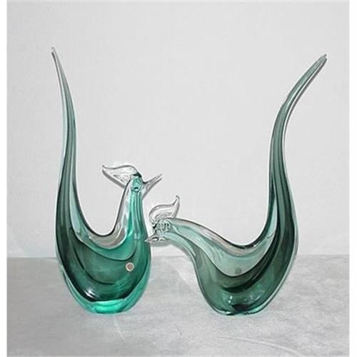A pair of large Murano glass birds, 18" tall, 7" & 10" long. The pair are of multi-color teal and clear. Condition is very good, no chips or cracks, each has a paper label shown. (11)