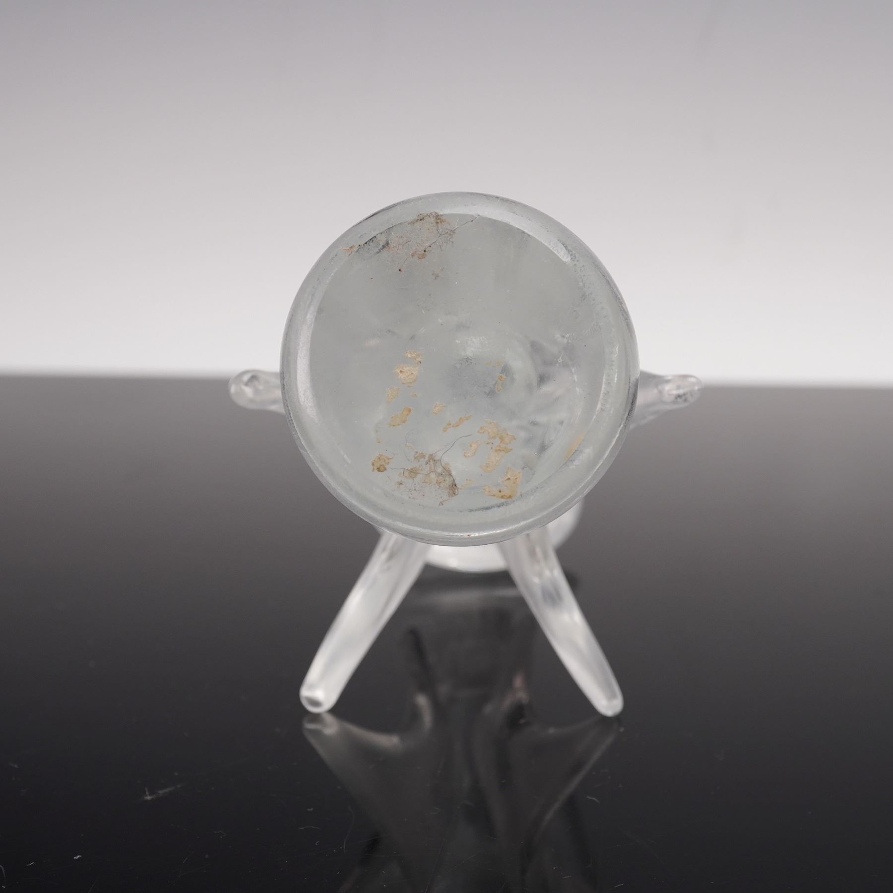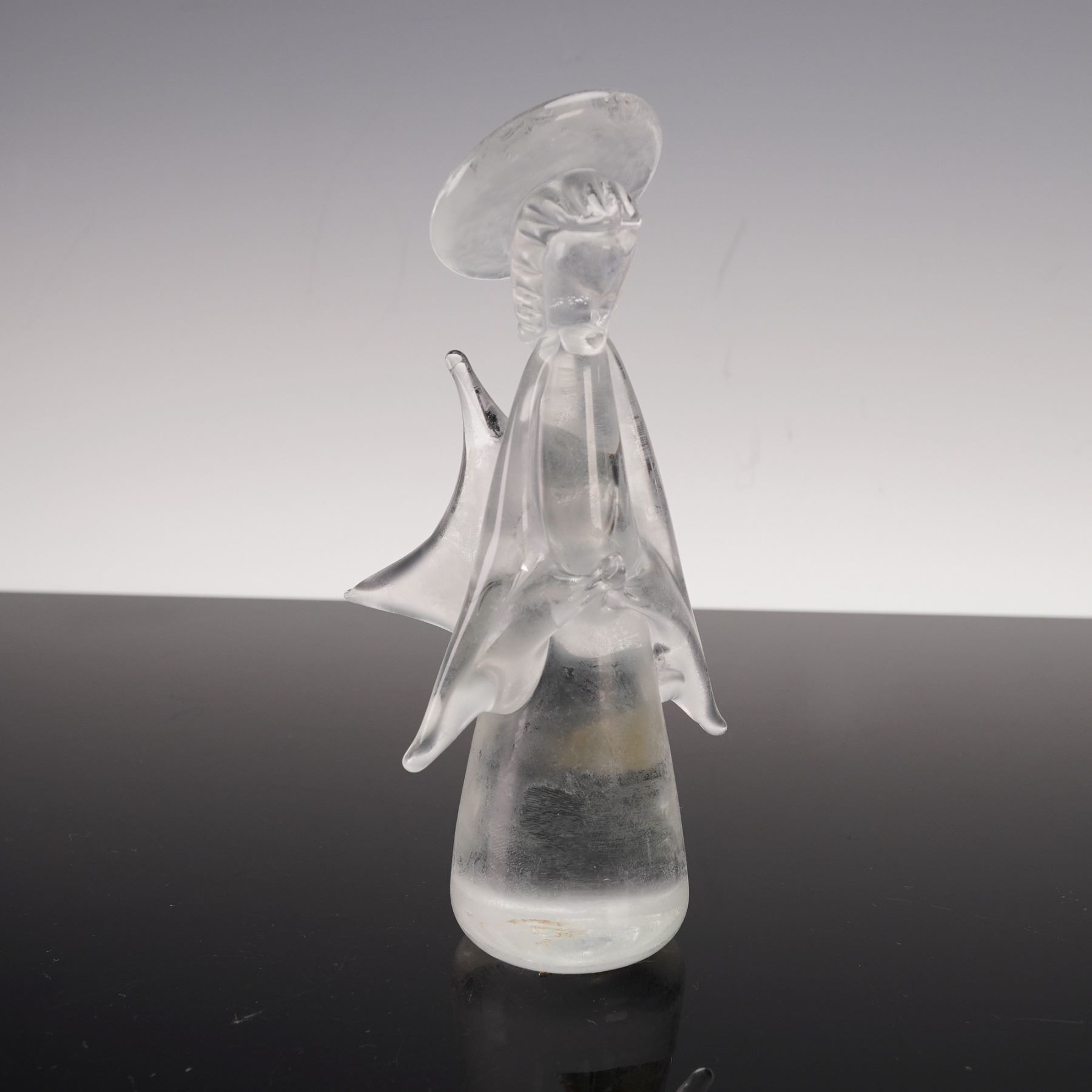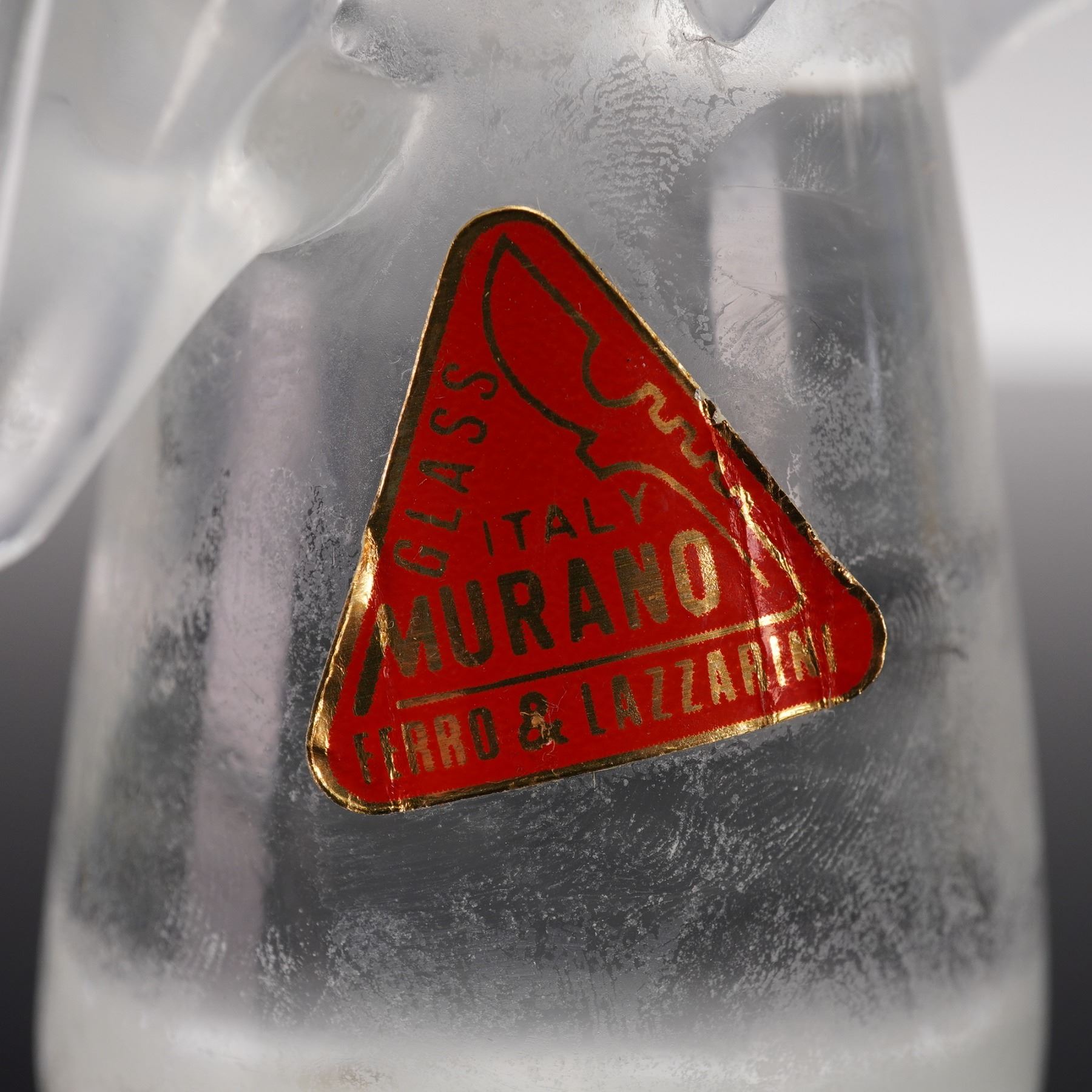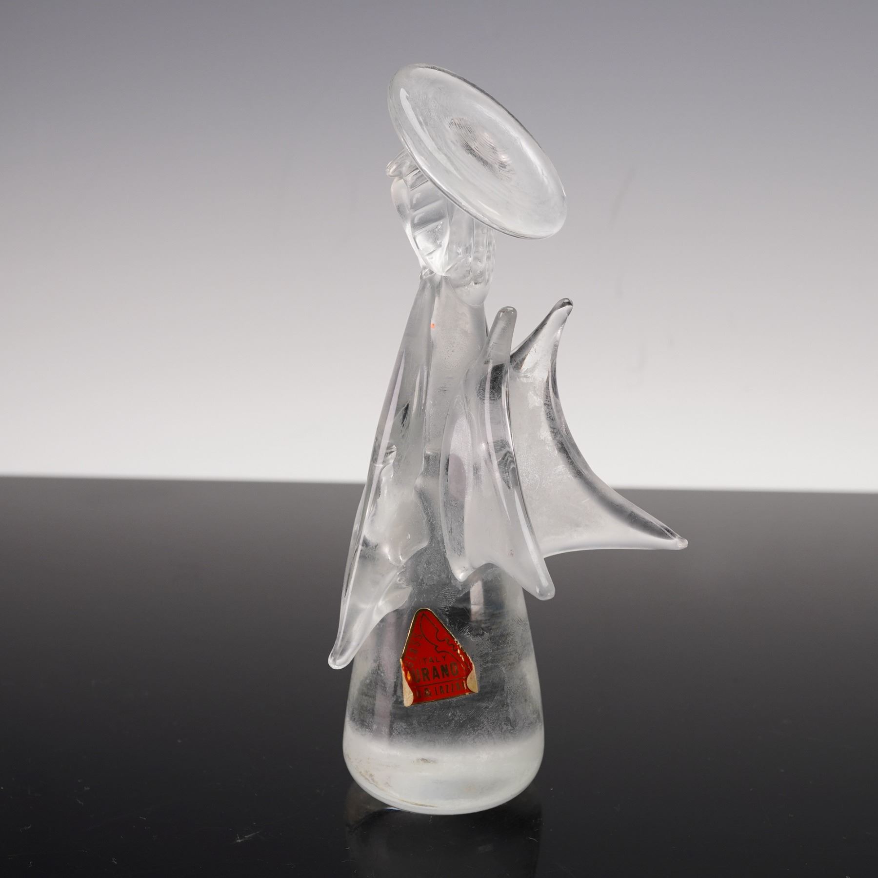 The figure has delicate wings that curve outward and a rounded halo resting above its head. The softly textured surface and gentle contours give it a serene and graceful appearance, with light catching beautifully across its transparent form. Murano Glass manufacturing sticker.