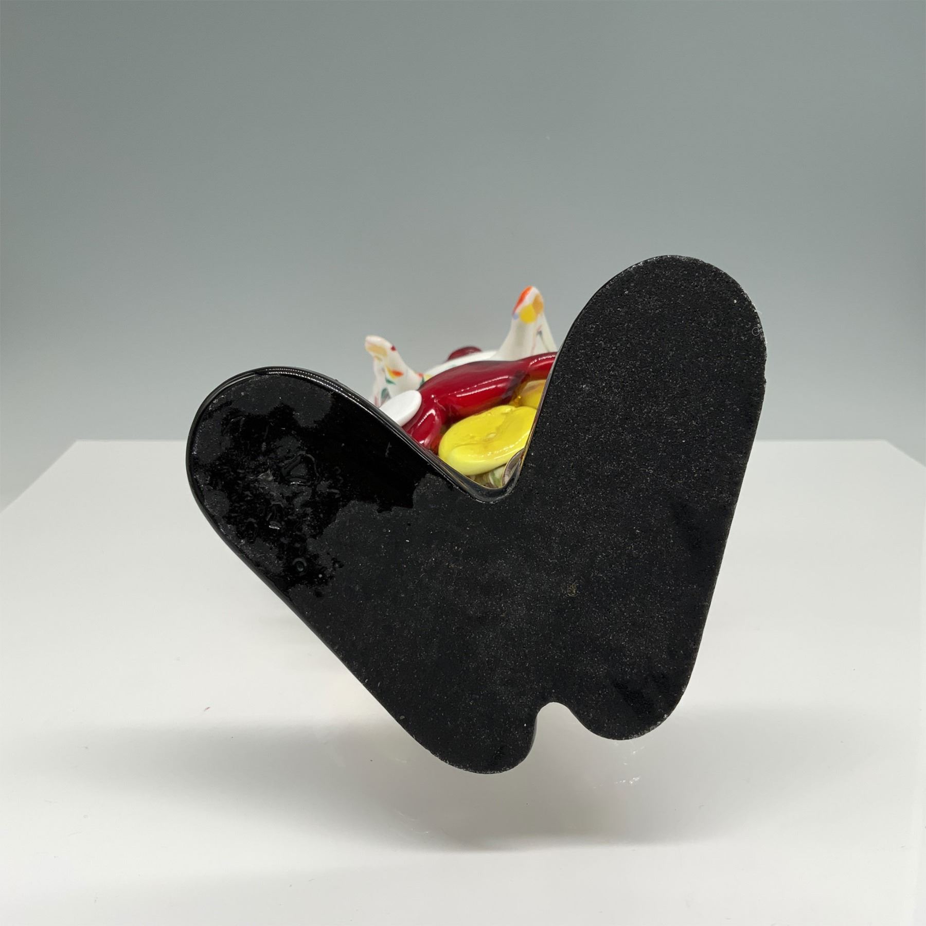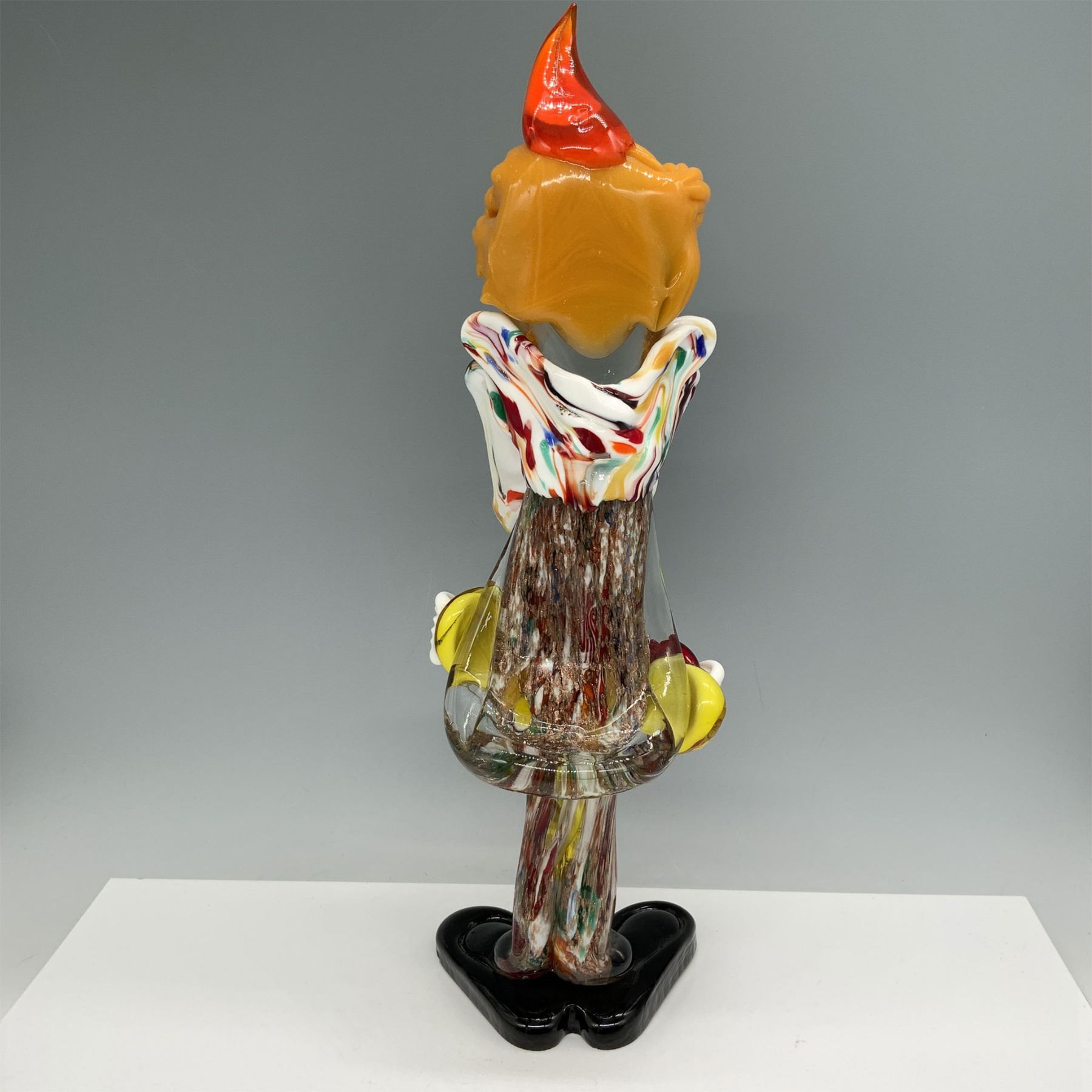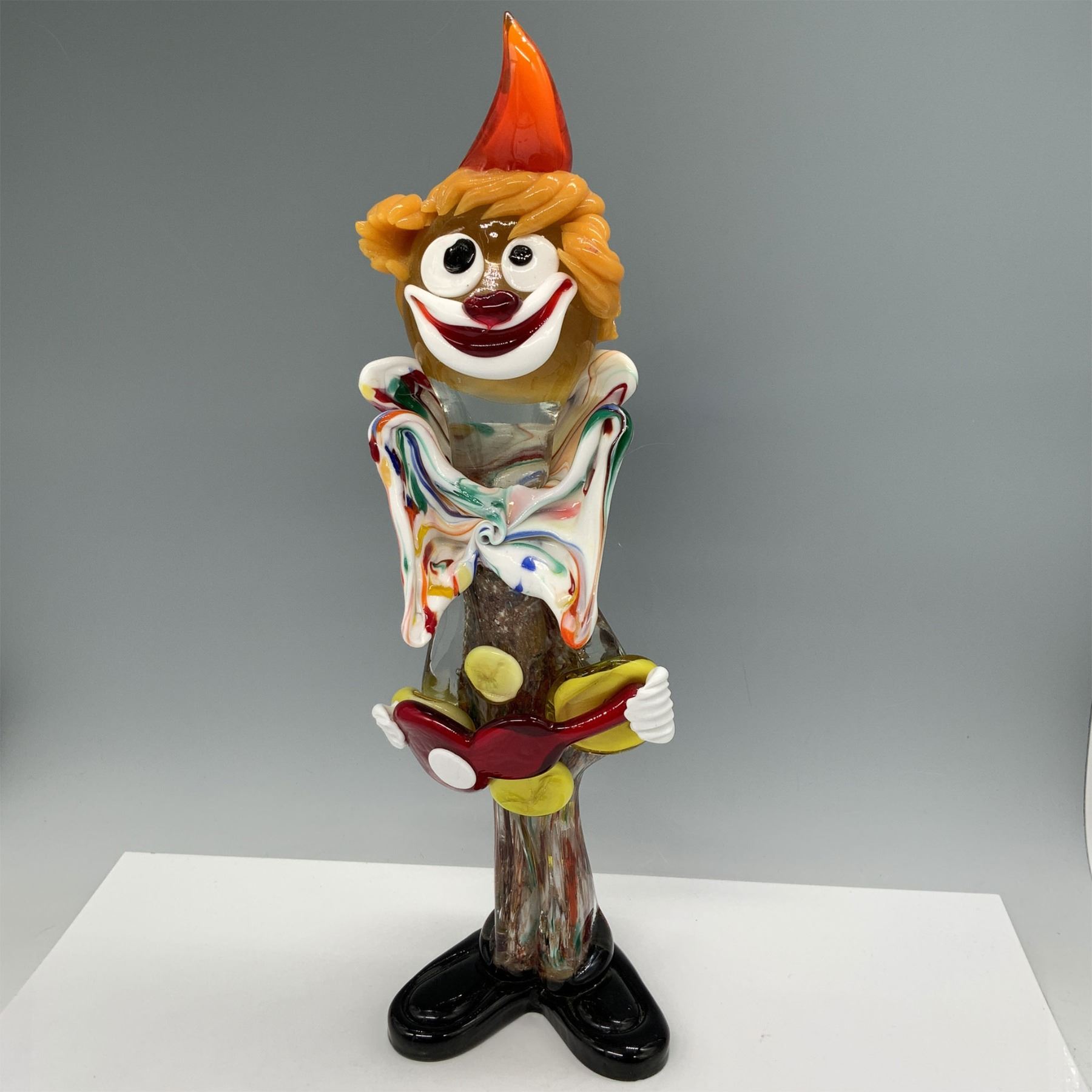 This unique Murano glass clown figurine features a vibrant, playful design, with a whimsical expression and an intricate mix of multicolored glass. The piece displays a mix of translucent and opaque glass, with detailed features such as bright orange hair and a wide smile. The clown is holding a toy, adding to the lively, joyful appearance. Made in the renowned Murano glass tradition, this piece showcases the creativity and craftsmanship that defines Venetian glass artistry. A stunning example for collectors and enthusiasts of Murano glass.