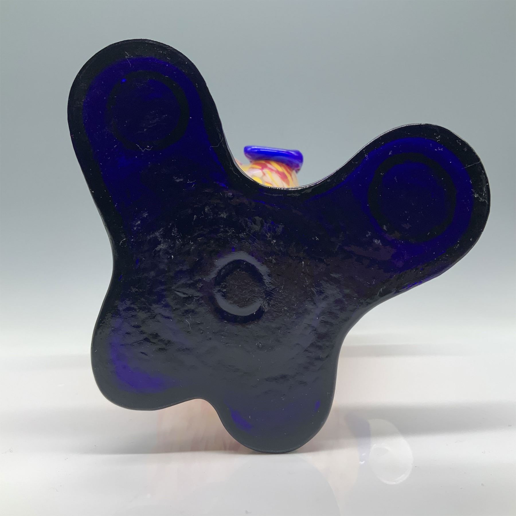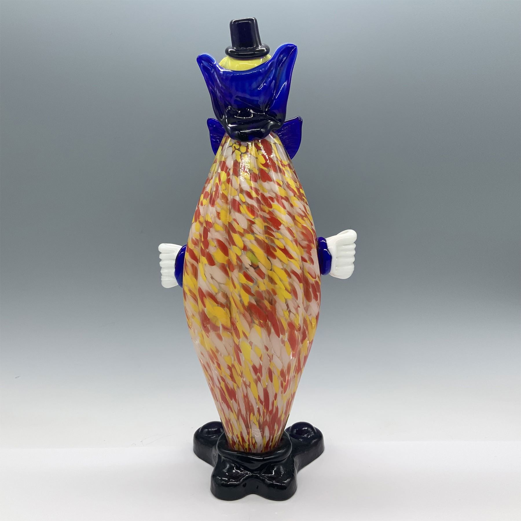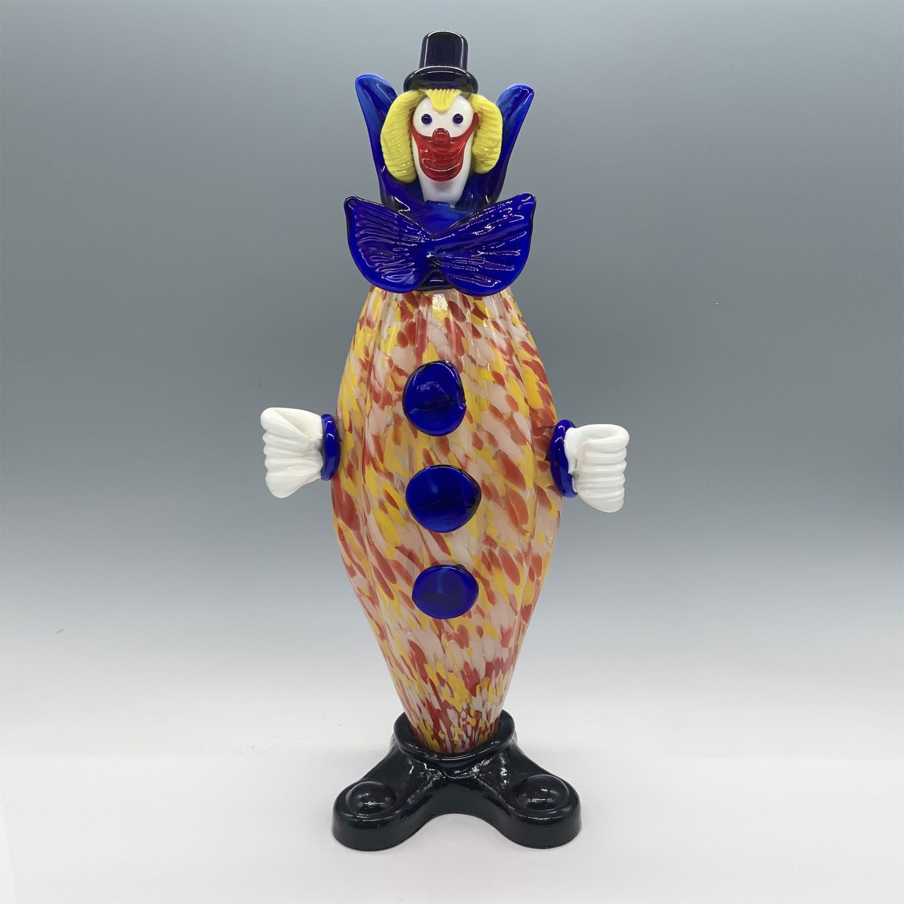 This charming Murano glass clown figurine showcases vibrant colors and intricate craftsmanship. The piece features a lively clown design with a multi-colored body in swirls of orange, yellow, and white, accented with blue buttons and a glossy black base. The clown's facial features, including a red nose and a bright bow tie, are all crafted with fine detail, adding character to the piece. Murano glass is renowned for its delicate artistry and exceptional quality, and this clown figurine exemplifies the signature vibrancy and playful style of Murano artisans.