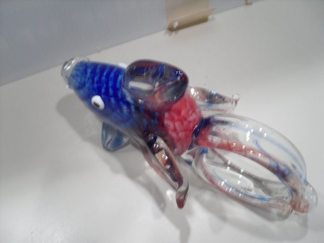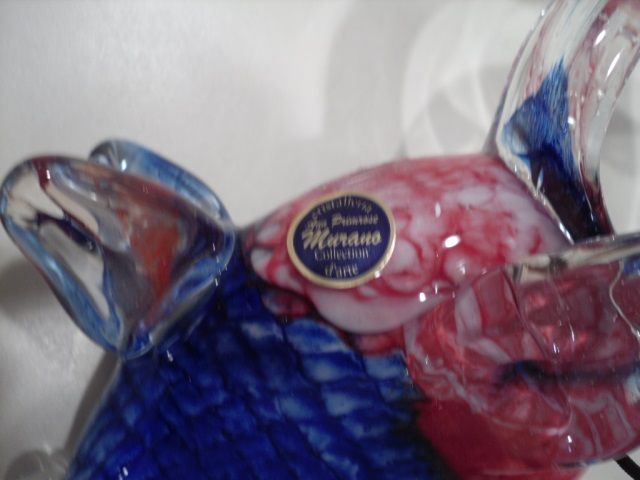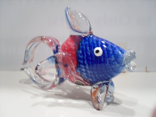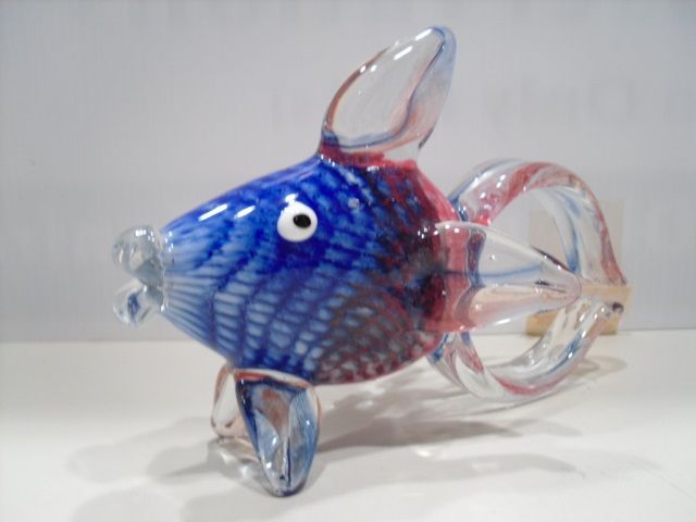 This figurine is a guppy fish. It is half blue and half red with a clear tail that connects together. It is approximately 7 inches by 10 inches.