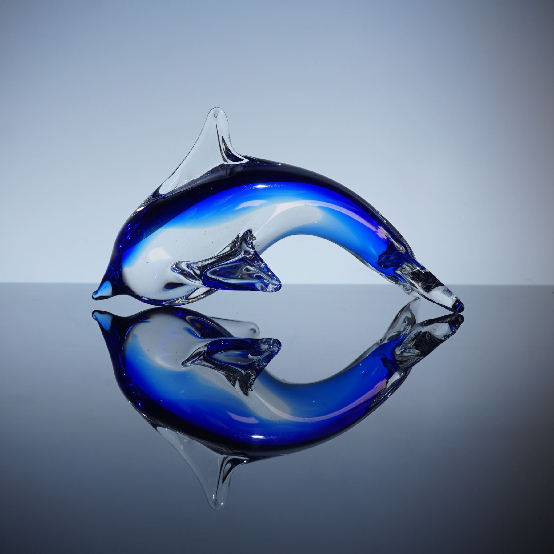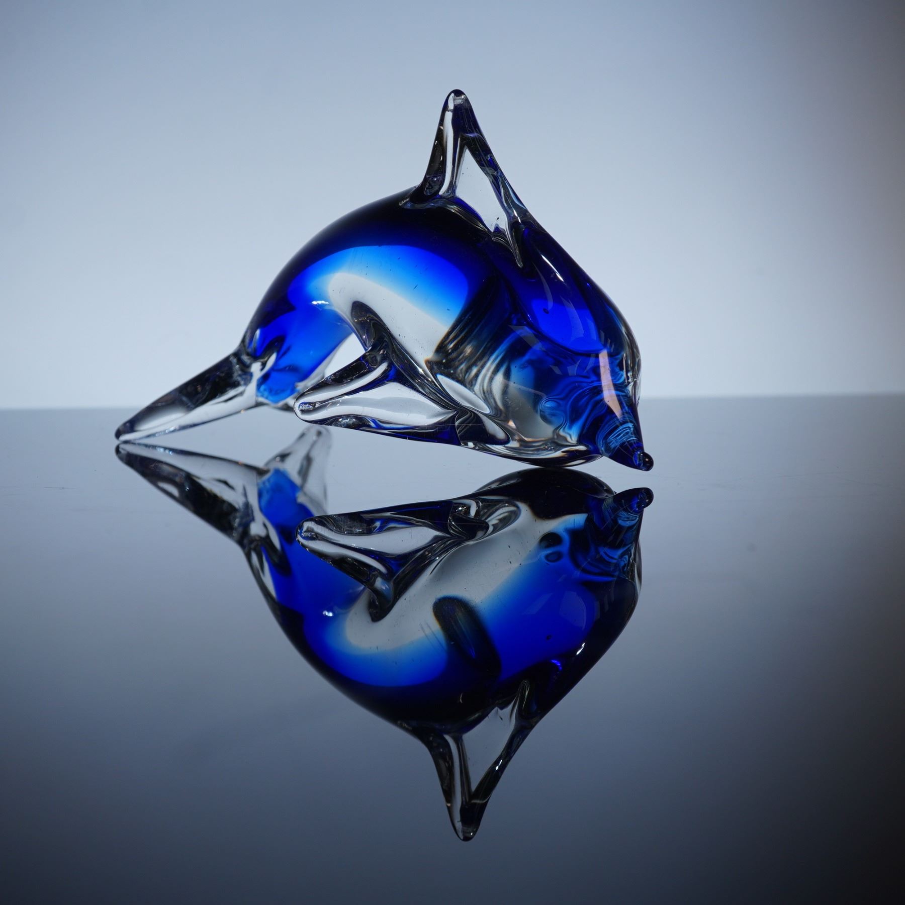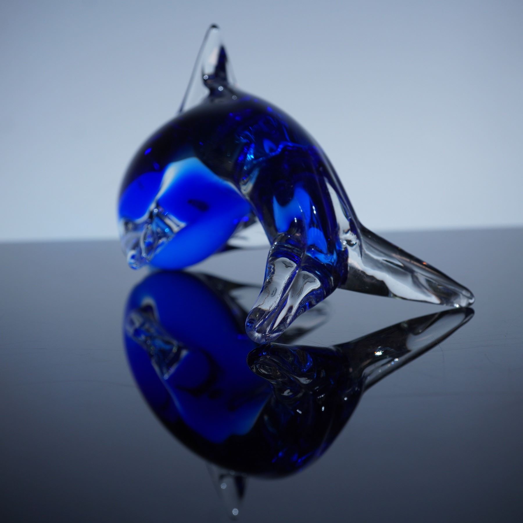 This hand-blown decorative piece showcases the iconic sleek form of a dolphin with a curved body, pointed fins, and smooth polished surface. The vibrant cobalt color is highlighted with clear glass accents at the fins and tail, creating a striking contrast and a reflective, sculptural effect.