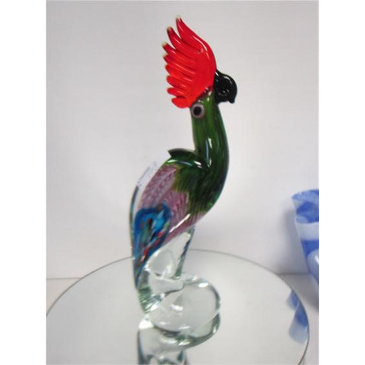Murano Glass-Parrot with multicolored body red crown black eyes and beak clear base11 1/4" very nice piece