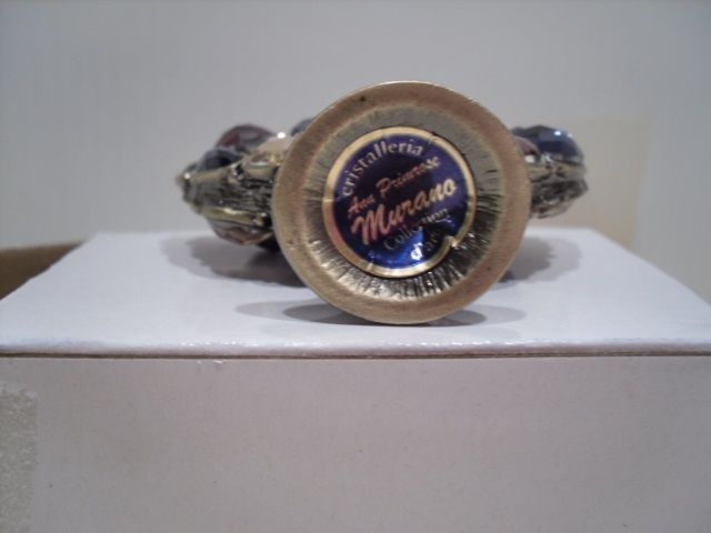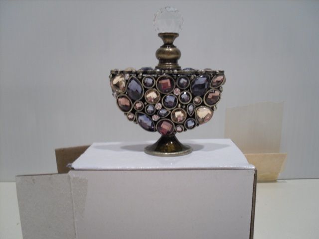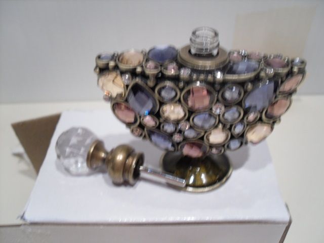 This decanter has purplish and champagne colored stones on the front and back. It is approximately 3 inches high with a 1.25 inch base.