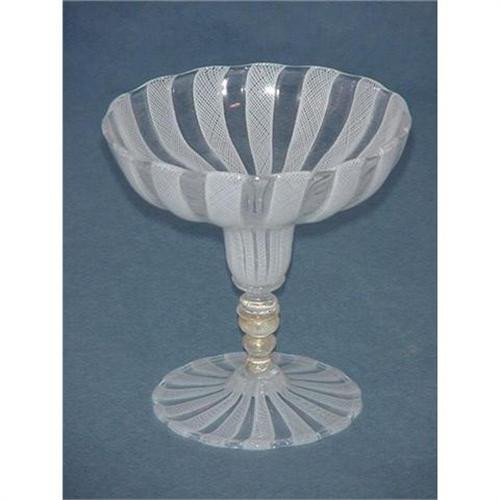 A Murano blown glass drinking glass, 4 3/4" tall, 4 1/2" top diameter. Clear glass and ribbons of white lace glass comprise the bowl and base of the glass, specks of gold decorate the stem. Condition is very good, no chips or cracks.