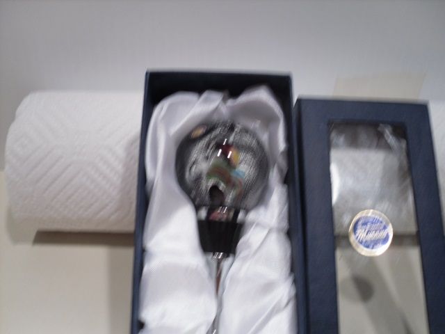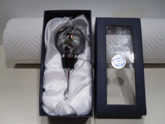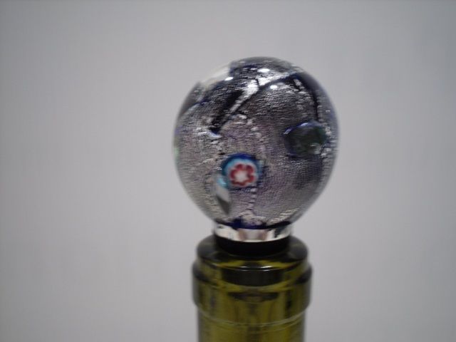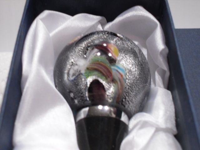 This ball is multicolored inside.This wine stopper is from the Cristalleria Ann Primrose Murano Collection d'arte. Comes in original box.