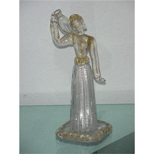 A Murano blown glass figure, 9" tall, 3 1/4" square base. The female figure is carrying an amphora, she is dressed in a long skirt with silver specks the base and the body of the figure have gold specks. She is in very good condition having no chips or cracks. (2)