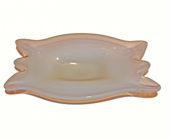 This Murano rectangular opaline dish has three notches on each end. It is difficult to capture the beauty of this dish with either words or pictures. It has the beauty of moonstone and is truly a functional piece.