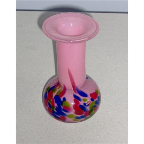 The vase is a visual treat! In a pink cased glass body, it shows strokes of cobalt blue, spring green and ruby red in a melange mainly in the area of the bowl. The inside of the bottom appears to be a bit like a kaleidoscope!<p>