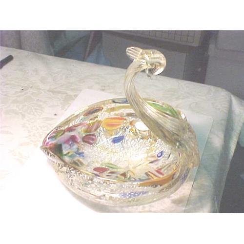 Murano Swan bowl. Not signed. 7-1/2" long x 7-1/2" tall. Lots of millifluri and silver coloring. Good condition with no damage...