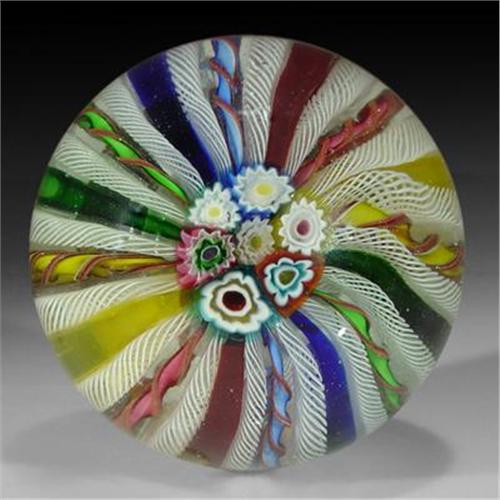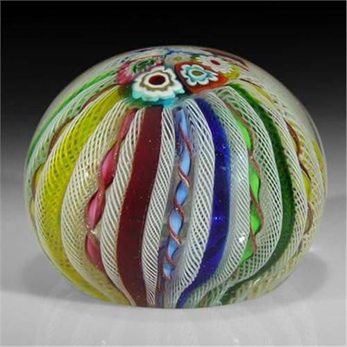 Murano crown paperweight. A cluster of complex canes rests at the top of the piece, surrounded by green, yellow, pink, and blue twists, which alternate with green, yellow, red, and blue rods, and white latticinio ribbons. Diameter 3 1/2.