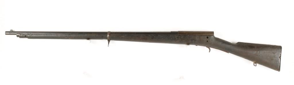 Early Japanese military single shot bolt action rifle with 31-1/4" barrel and missing bolt. Appears to have been used as a parts gun as trigger guard, numerous screws, and rear sight are missing. Is restorable or numerous parts still usable. *Antique Firearm*