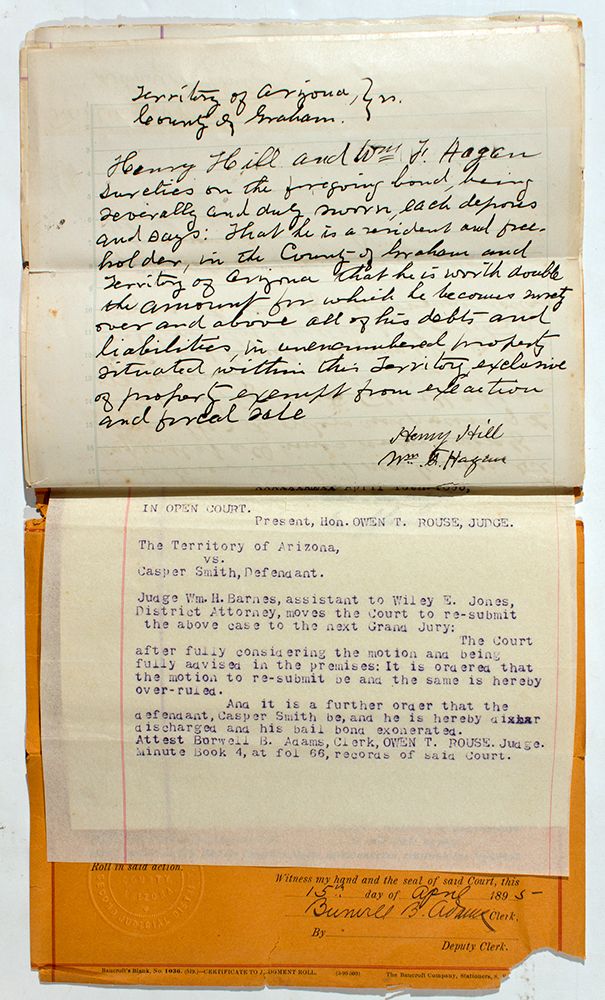 This lot contains information Graham County District Court paperwork regarding the murder of Mason “Lee” Slaughter. Slaughter was shot and killed on July 2, 1894 in Morenci, Arizona by “Cap” Smith. According to Arizona pioneer Evans Coleman, the murder came as no surprise as he had “never met a person who had a good word for old Mase and that his moral fiber was worn to a frazzle.” The documents date between 1894 and 1895. The documents had some wear including tears. - HKA#65827