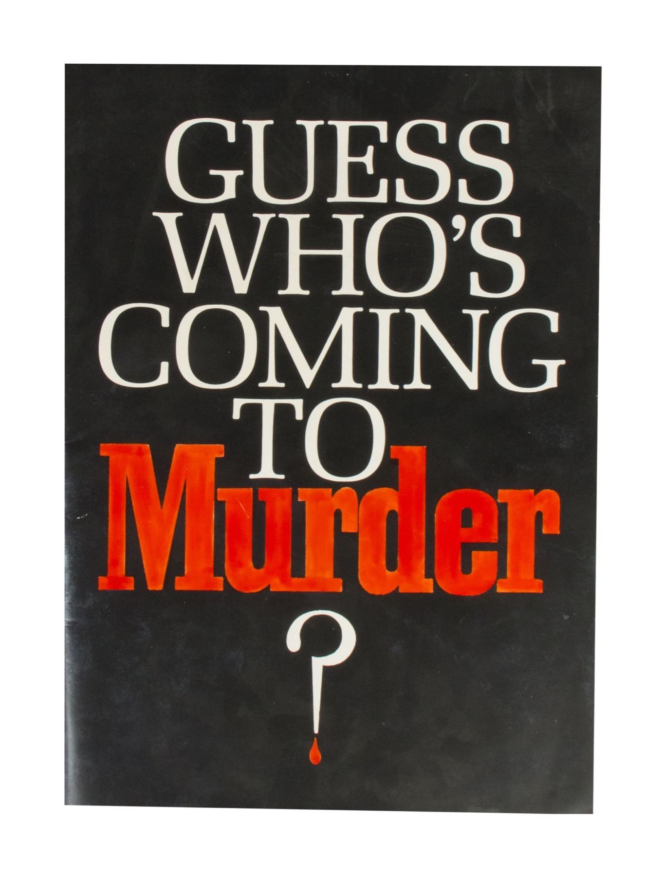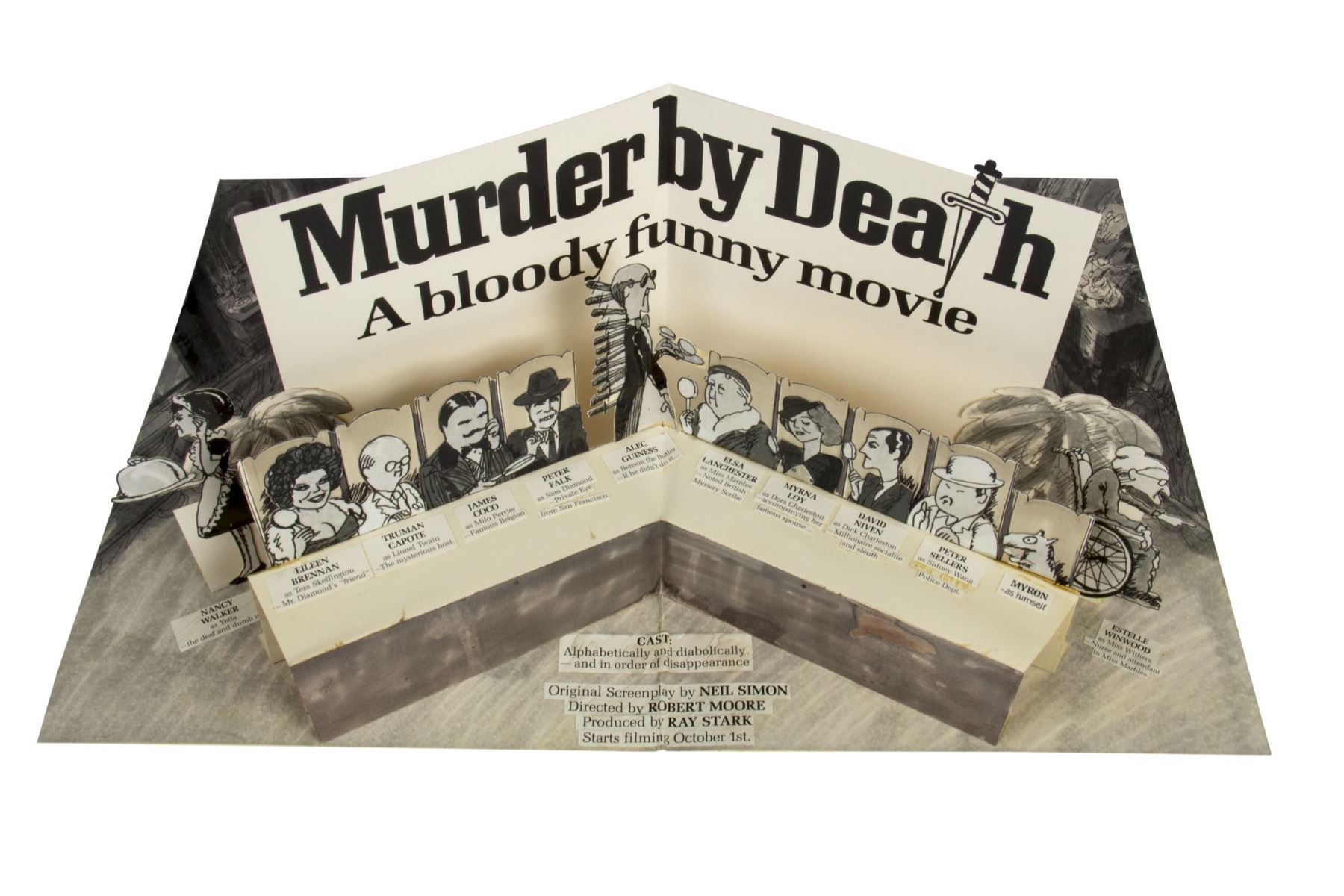 (Columbia, c.1976) A hand-crafted prototype promotional card for Columbia Pictures feature film "Murder by Death". This card features many printed elements that have been hand-trimmed to image and adhered to this pop-up card. Similar to a more finalized pop-up which would be produced to promote the film, this earlier prototype features the central cast drawn in the Charles Addams style seated around a dinner table. Measuring 14"x10" while closed, this fantastic hand-crafted prototype is in fair to good condition with some wear and spots of adhesive discoloration from age and use.